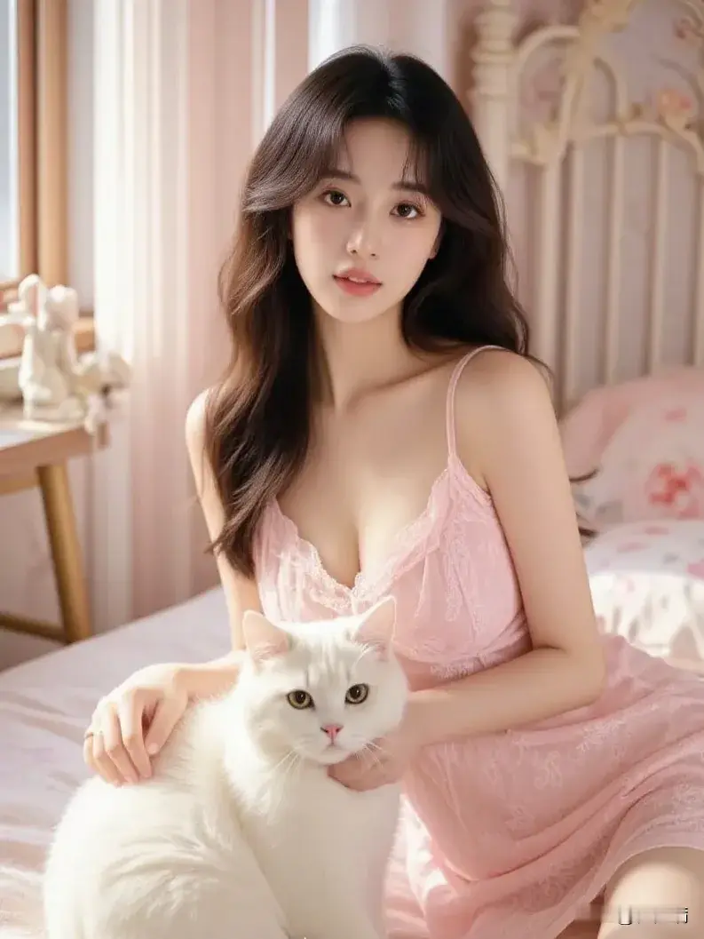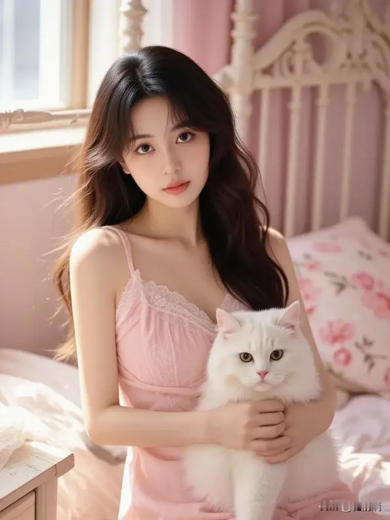 粉嫩卧室中的甜美少女,与猫咪相伴,温馨至极💕✨