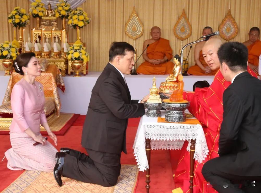 泰国国王玛哈·哇集拉隆功和王后苏提达在北京灵光寺拜佛时,面对中国高僧,竟然虔诚地双膝跪地,行了跪拜大礼。 但这一次,角色反转,泰王却主动向中国高僧低头。希望某些人不要渲染成高僧,那是很不礼貌行为,国王夫妇拜的是佛,是佛家圣物舍利牙,所以对掌持舍利高僧有此一拜,并不是跪高僧本人。高僧是佛法僧三宝之一,估计与泰国的传法寺院有很深的因缘吧,功德无量。泰国佛教地位无上高,上到泰王下到普通士兵,看见高僧都得跪拜。人性在,敬仰在,敬畏在,泰王室令人尊敬。佛法僧三宝,国王拜的不是人那个外形,而是礼拜的自性,礼拜的师父,依教奉行。