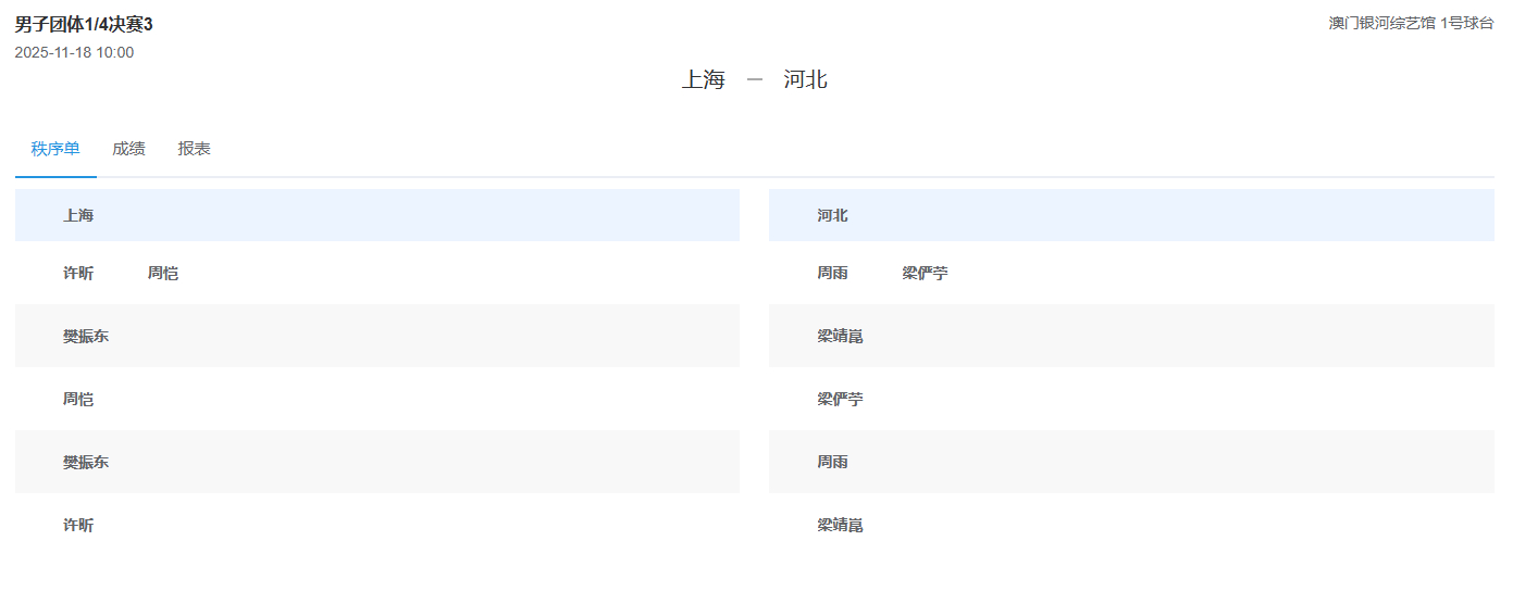 【男团1/4决赛 上海vs河北】比赛将于10:00开始,央视频、咪咕视频1号桌直播,具体对阵如下:第一盘,许昕/周恺 vs 周雨/梁俨苧;第二盘,樊振东 vs 梁靖崑;第三盘,周 恺 vs 梁俨苧;第四盘,樊振东 vs 周 雨;第五盘,许 昕 vs 梁靖崑。樊振东加油!上海队加油!