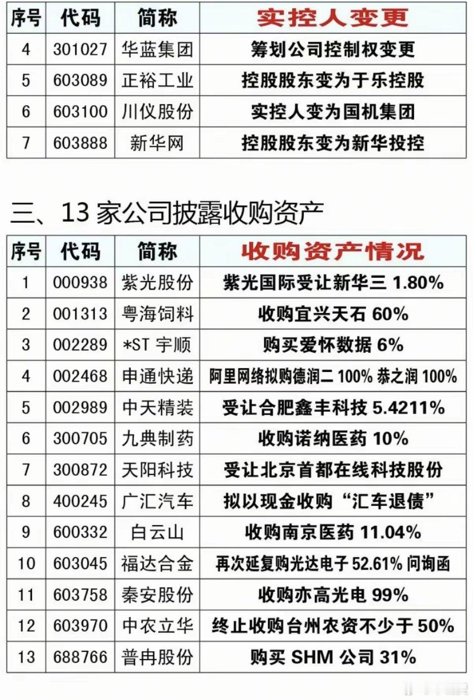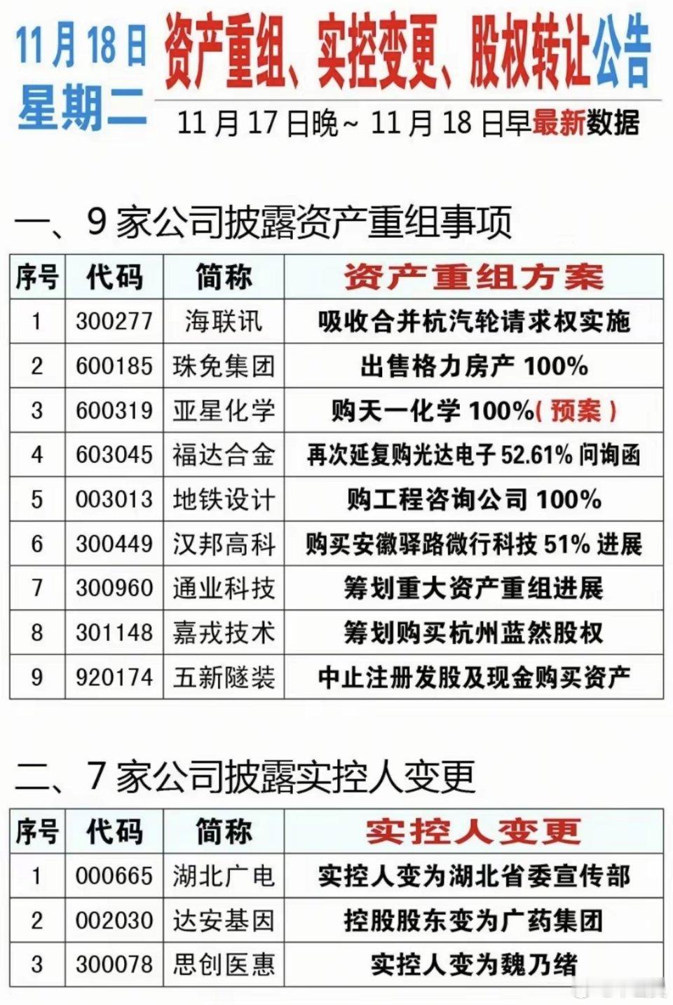 11月18日 最新:资产重组、实控变更、股权转让公告!9家资产重组7家实控人变更13家收购资产20家股权转让3家出售资产