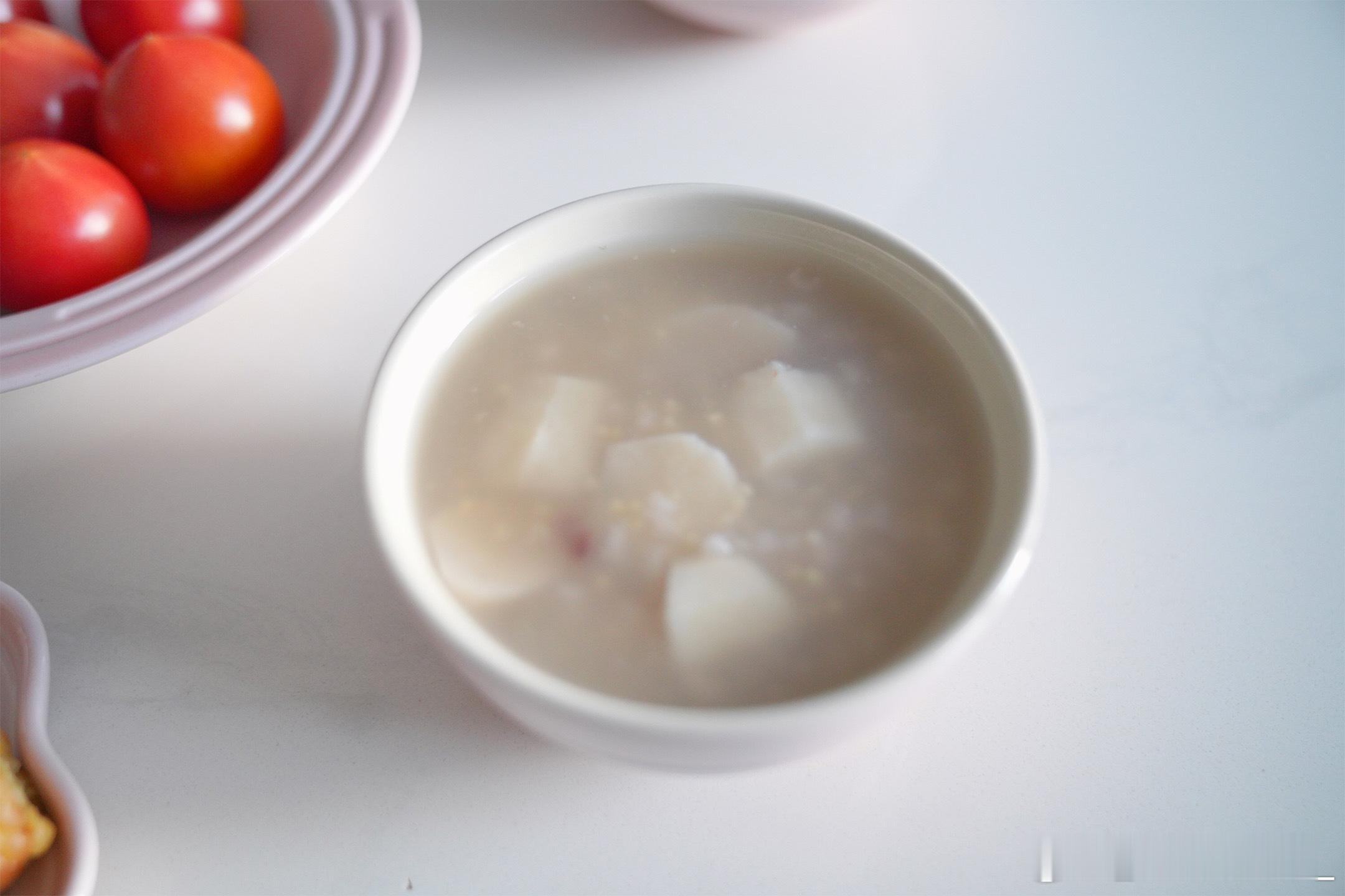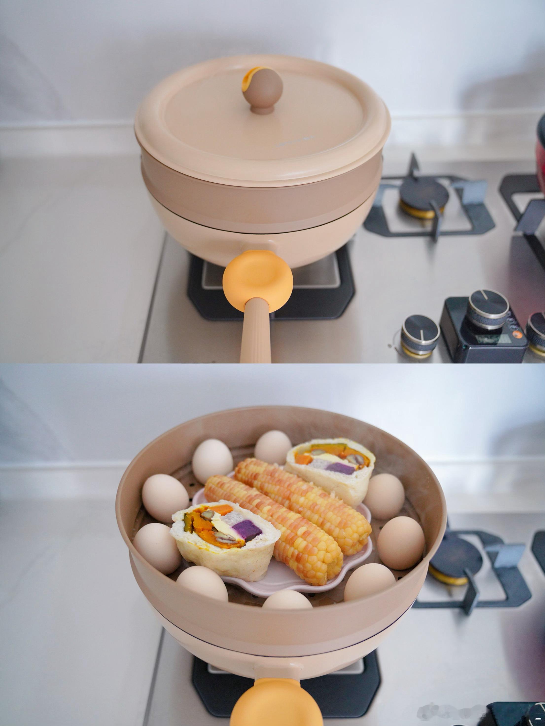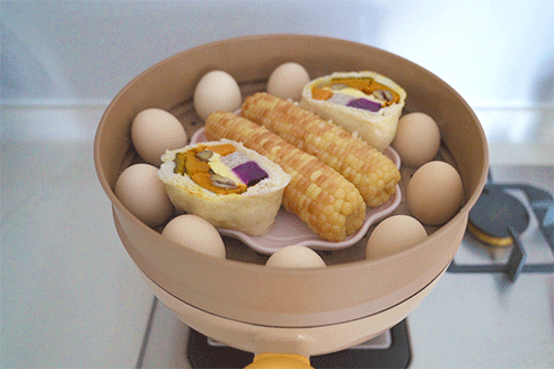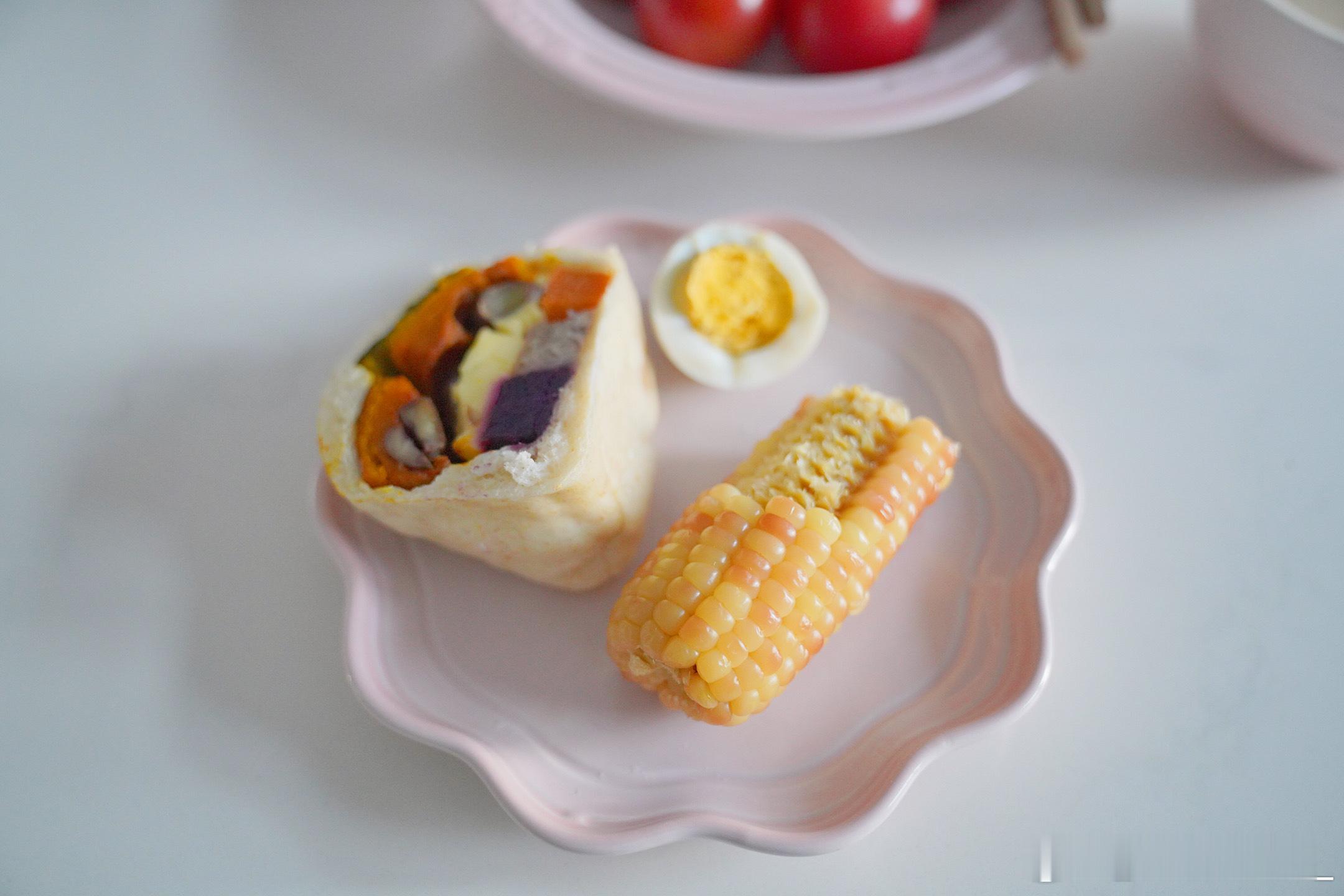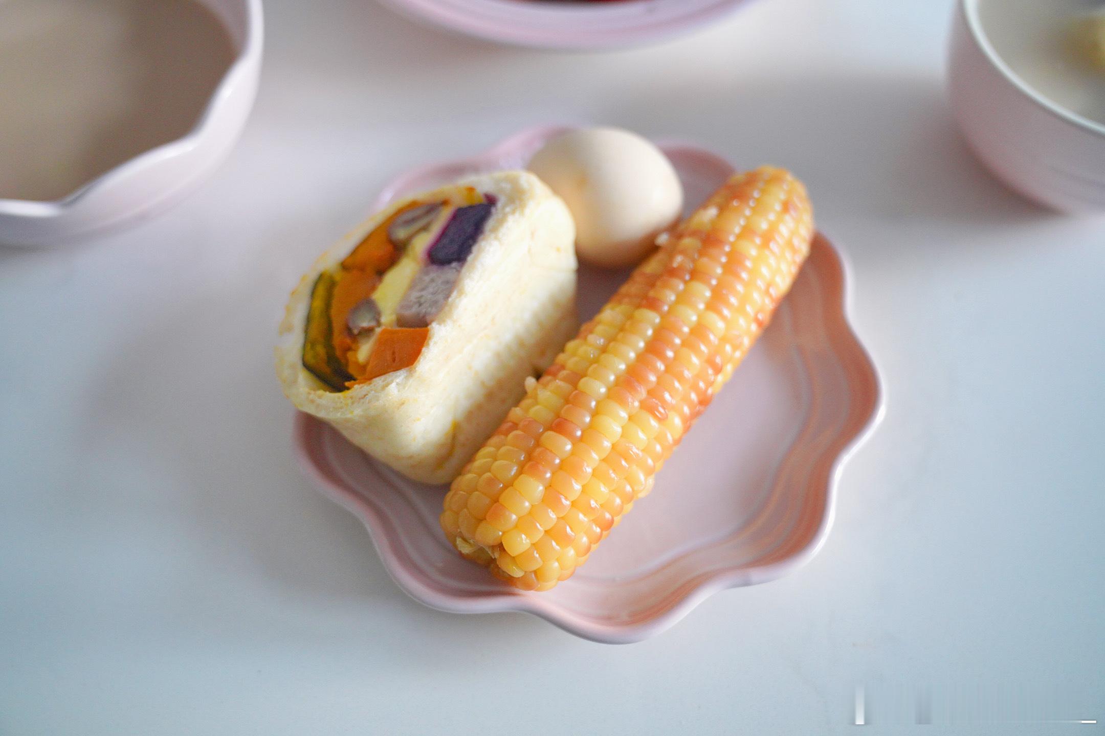 周二早饭五谷杂粮馒头、糯玉米、蒸蛋、山药粥、玫瑰红枣牛乳茶、小番茄~