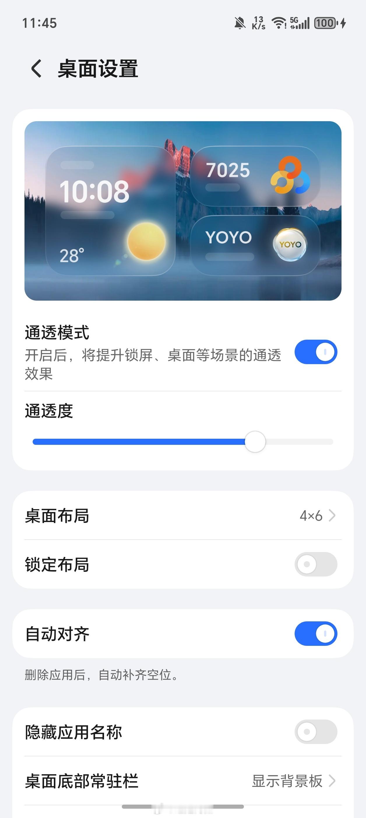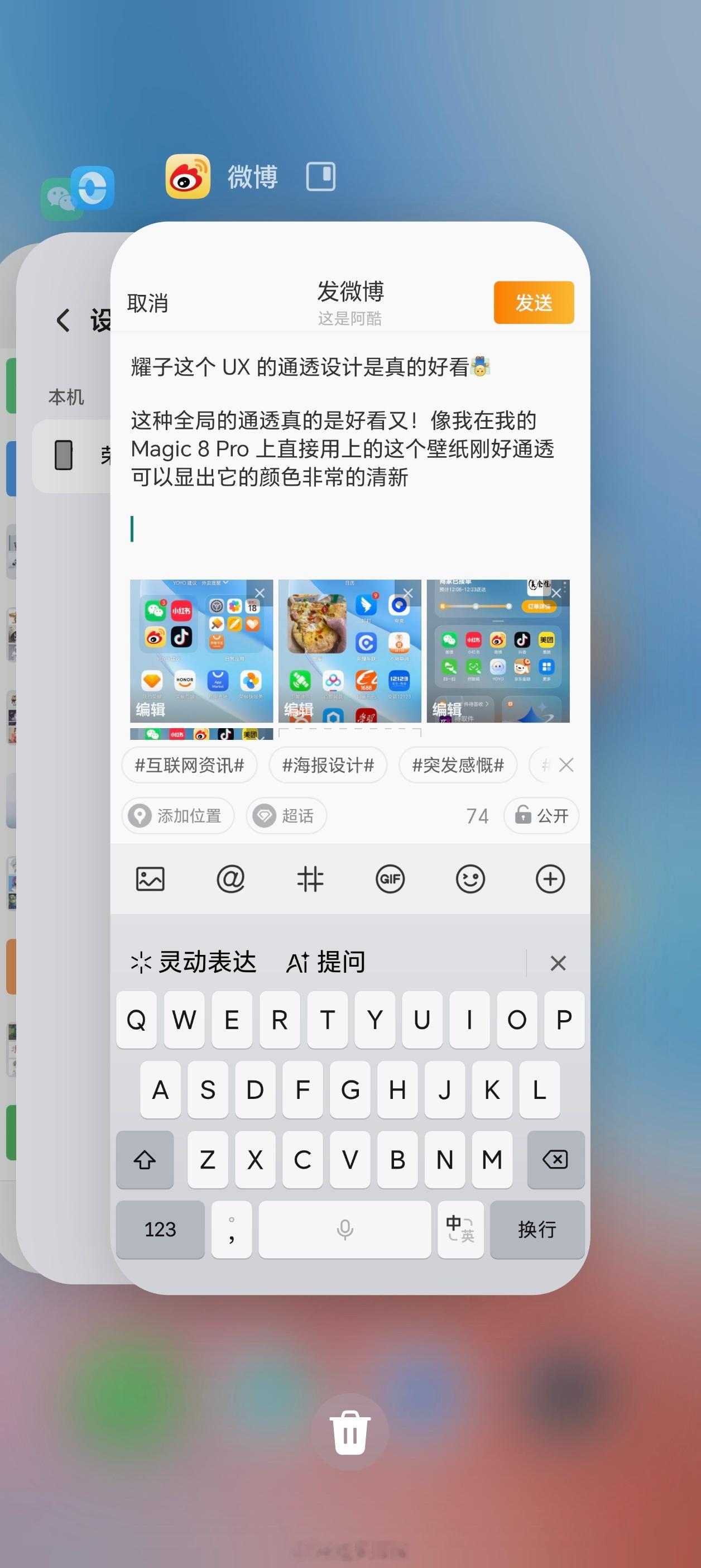耀子这个 UX 的通透设计是真的好看 Magic 8 Pro 越用越爱啊这种全局的通透真的是好看又!像我直接用的这个壁纸刚好通透,可以显出它的颜色非常的清新你可以在后台自由选择是否开启通透模式,甚至还可以实时调节整体通透的透明度。而且最近后台还上了堆叠的显示风格,有点意思!