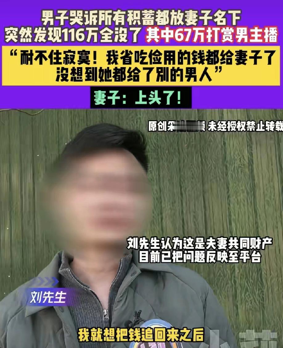 “我省吃俭用住300块的房,她打赏男主播67万”丈夫崩溃:8年存款,一分不剩! 真的是,听到这事儿都替刘先生心酸。八年省吃俭用,租着300块一个月的房子,辛辛苦苦攒下116万,本想着给孩子将来、给家里添点底气。结果呢?妻子在家带娃,却迷上了直播打赏,一口气给男主播刷了67万!剩下的钱花哪儿了,自己也说不清,还倒欠网贷8万多。 刘先生哭着说:“我这么信她,她却背刺我……”而妻子只轻飘飘一句“我上头了,帮他们打PK”。哎,隔着屏幕是热闹,转过头来,家底掏空,婚姻也碎了。 有人说,这钱要是拿来带孩子旅游、买衣服、吃点好的,哪怕全家一起奢侈一把,也花得值啊!偏偏是刷给屏幕那头连面都没见过的“主播”,实在让人想不通。 目前刘先生打算通过法律途径追回部分钱款,之后选择离婚。不知道大家怎么看?这样的“打赏”,算不算夫妻共同财产?能要回来吗?