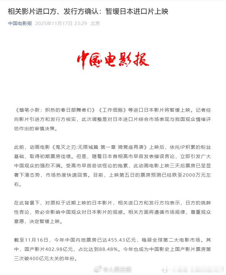 【】据中国电影报,《蜡笔小新:炽热的春日部舞者们》《工作细胞》等进口日本影片将暂缓上映。记者经向影片引进方和发行方核实,此次调整是对日本进口片综合市场表现与我国观众情绪评估作出的审慎决策。此前,动画电影《鬼灭之刃:无限城篇 第一章 猗窝座再袭》上映后,依托IP积累的粉丝基础,取得初期票房佳绩。但是,随着日本首相高市早苗发表错误言论,立即引发广大中国观众的强烈不满。受高市早苗奇谈怪论的拖累,此动画电影上映三天后票房已呈显著下滑态势,市场热度快速回落。目前,上映第五日的票房预测已经跌至2000万元左右。在此背景下,对原拟于近期上映的日本影片,相关进口方和发行方均表示,日方的挑衅性言论,势必会影响中国观众对日本影片的观感。相关方面将遵循市场规律,尊重观众意愿,决定暂缓上映。截至11月16日,今年中国内地票房已达455.43亿元,稳居全球第二大电影市场。其中,国产影片402.98亿元,占比达到88.48%。今年也成为中国影史上国产影片票房第三次破400亿元大关的年份。