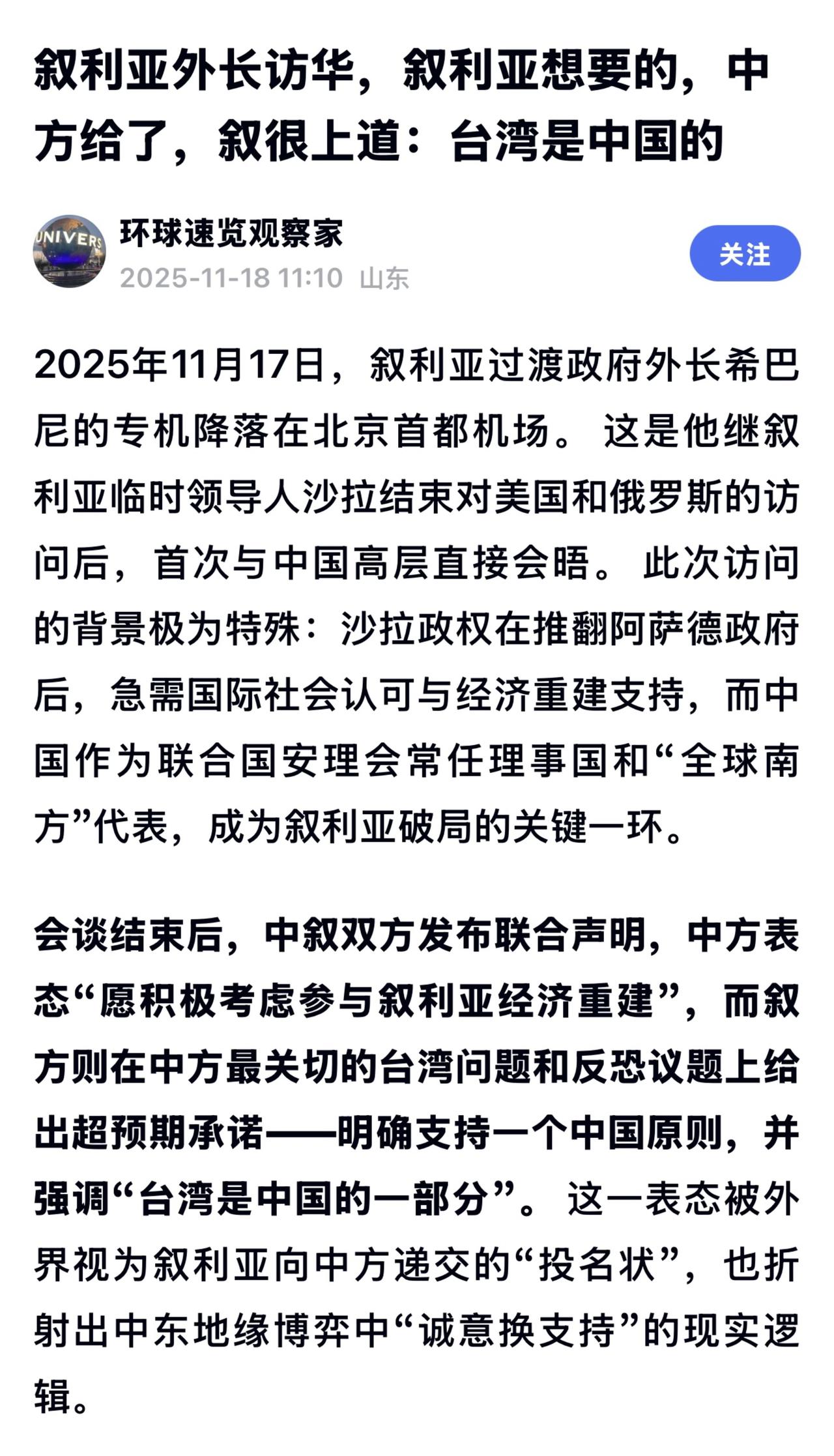 2025年11月10日,叙利亚过渡政府总统艾哈迈德•沙拉正式访问美国,成为叙利亚1946年独立以来首位到访白宫的领导人。 美国总统特朗普与其会晤后宣布取消自叙利亚危机以来实施的经济制裁,同时延长180天制裁豁免期限。双方签署打击“伊斯兰国”联合声明,叙利亚将加入美国主导的国际反恐联盟。 此前,英国宣布解除对叙利亚总统沙拉制裁后,欧盟表态将响应;联合国安理会也通过一项美国起草的决议,解除对叙利亚过渡总统沙拉的制裁。标志着国际社会对叙关系的进一步改善。