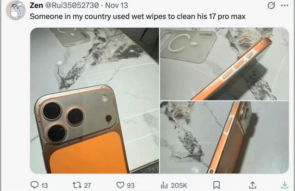 这都不是变色那么简单了,直接掉色褪色了,应该是发生化学变化了,产生反应,铝合金表面的着色直接掉了。玻璃后壳色彩是侵入的,所以不受影响。