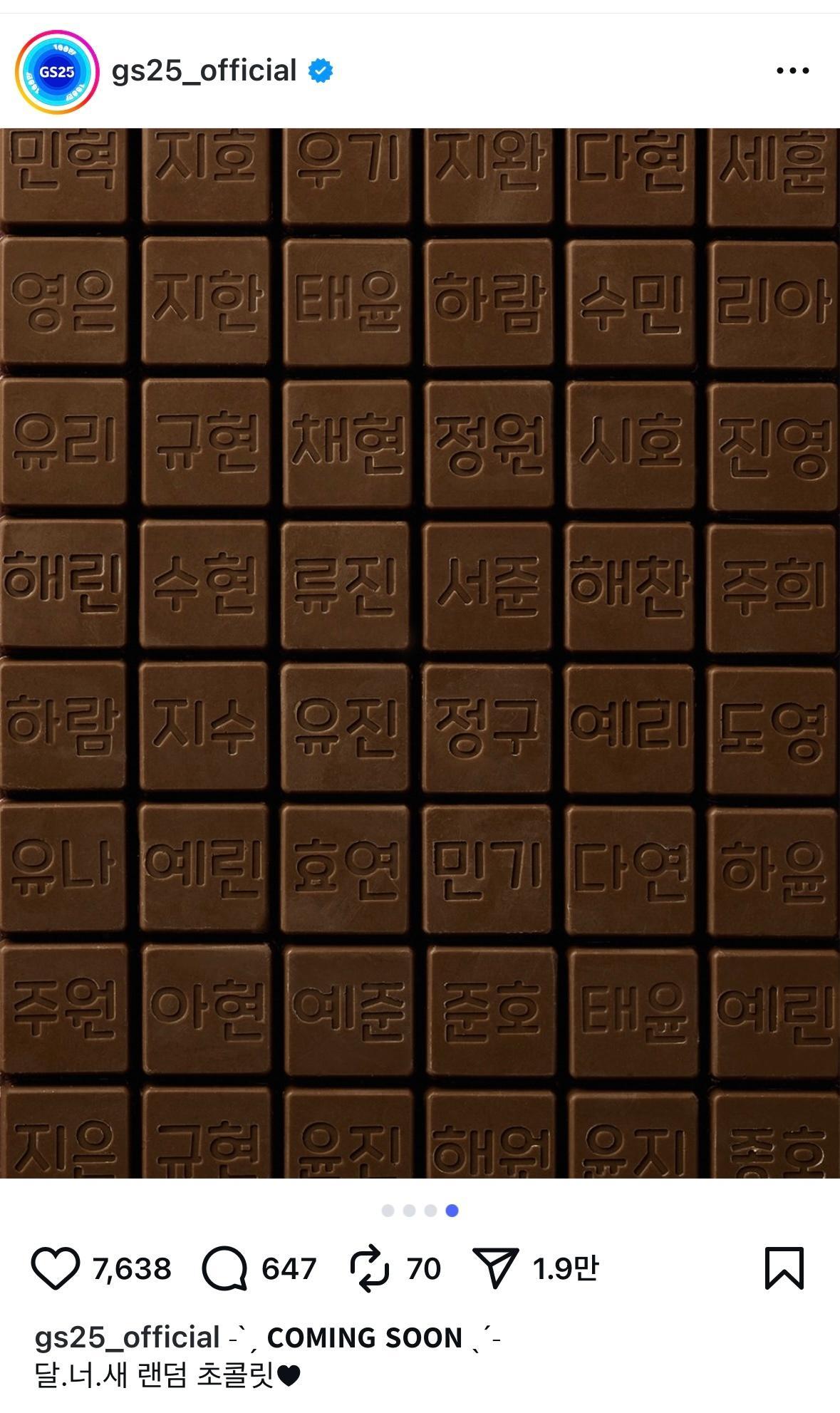 把爱豆名字印在巧克力块上的GS25新品,据说有195种名字
