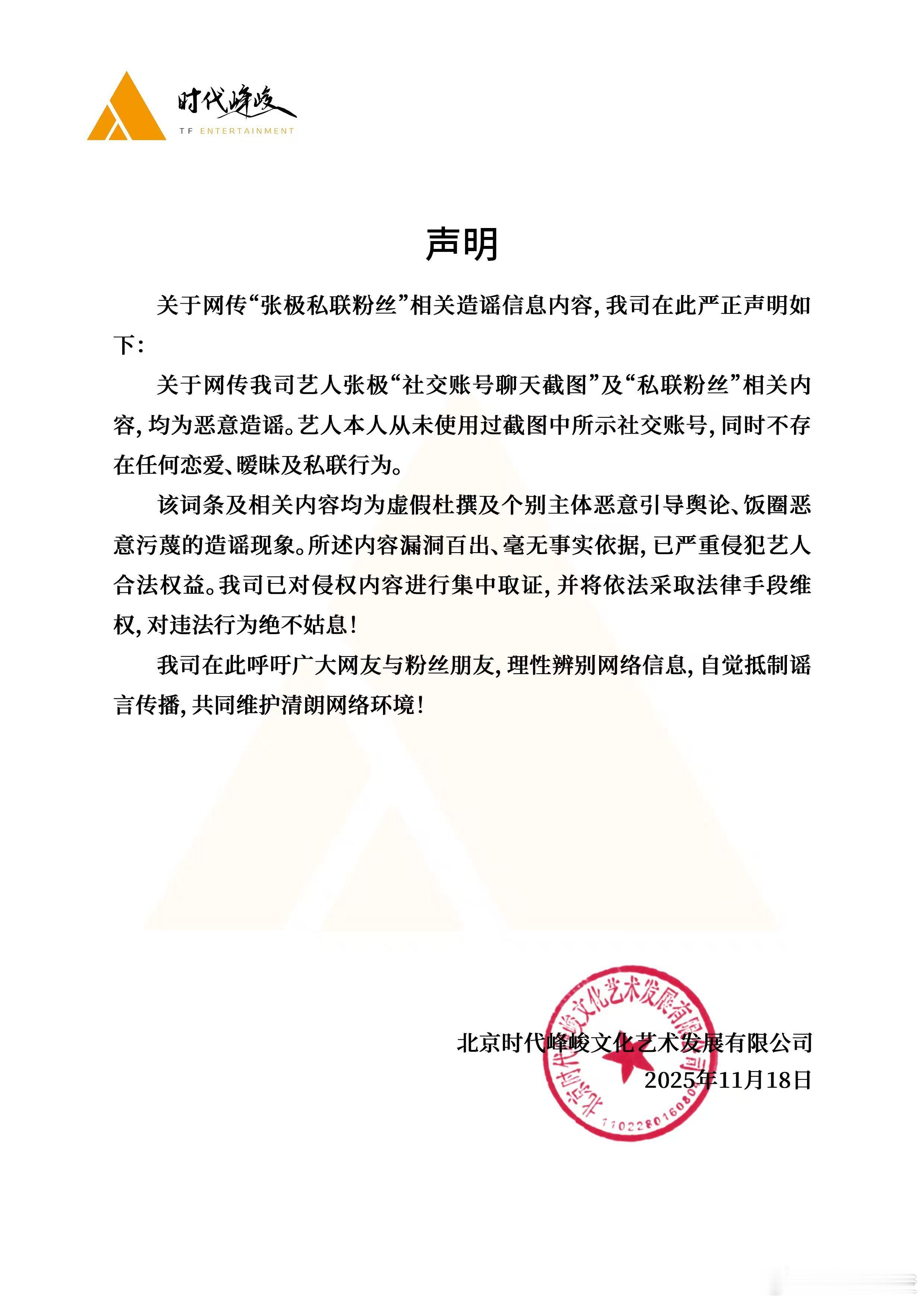 【张极】 时代峰峻辟谣张极私联粉丝,请不要再传了