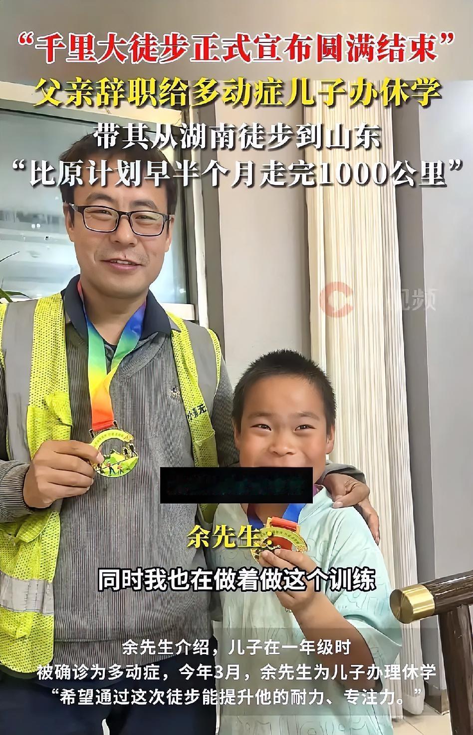 9岁的多动症的小男孩, 徒步1000公里从湖南走到山东, 多动症的精力这么好吗? 湖北有位爸爸,为了9岁的多动症儿子,直接辞了工作,给孩子办了休学,拉上另外两组家庭(一组是一个妈妈带一个孩子 ,一组是一个妈妈带两个孩子,都是山东人),一行7个人,从湖南慈利出发,要徒步1000多公里走到山东聊城! 原本计划用60天走完,没想到走到河南地界后,地势平坦,每天能走30多公里,最后一天甚至冲了45公里,11月14号就到了,提前到达目的地,整整早了半个月! 这一路上余先生管后勤保障,两位妈妈带大一点的孩子,下午他再接手带小的,7个人分工明确...... 我们总说多动症的孩子难带,想着靠药物来干预,但余先生用行动证明,大自然才是最好的“疗愈师” 有研究发现说,长期的户外活动能显著提升注意力,小景(余先生的孩子),这一路不仅长高了两三公分,更重要的是他眼里有了光,这精神面貌比再教室里面强多了! 现在的家长总是在焦虑自己的孩子输在起跑线,却忘了小朋友的成长不是在温室里面硬逼出来的。 余先生用他1000公里的陪伴告诉我们,教育从来不是让孩子坐得住,而是让他敢闯、敢拼,找到自己的力量支撑。这样的成长,才是孩子们能够受益一生的精神财富!