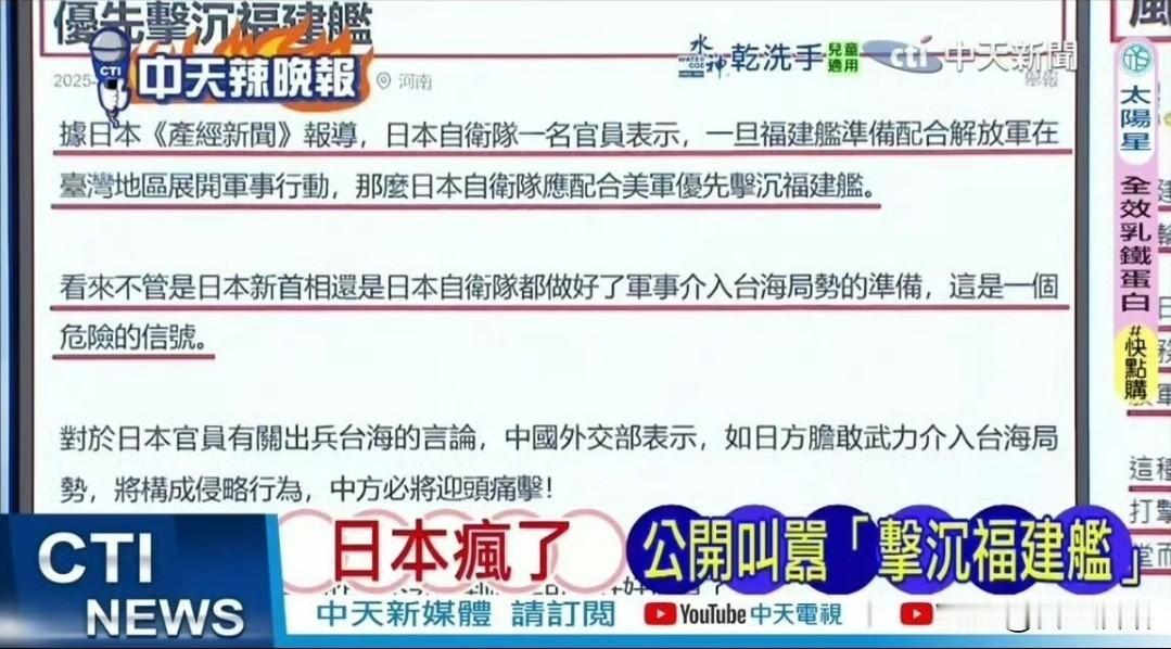骂张雪峰捐款论是鼓动战争的媒体和各路营销号,请以同样的标准批判一下日本人吧,人家都说要击沉福建舰了,请问,按你们那个标准,他这算不算鼓动战争? 张雪峰说的是个假设性的话,说的是若最终是武统的方式,那么他愿意捐钱,这就被某些人说成鼓动战争。 那么如今日本人说若福建舰对台展开军事行动,那么就击沉福建舰,这个最低也得等于张雪峰那句话了吧?若再细究其用词,那可是比张雪峰那句话力度还更大,请问,我们的媒体呢?我们的自媒体呢?我们的营销号呢?说话啊! 你们倒是批评日本人啊!