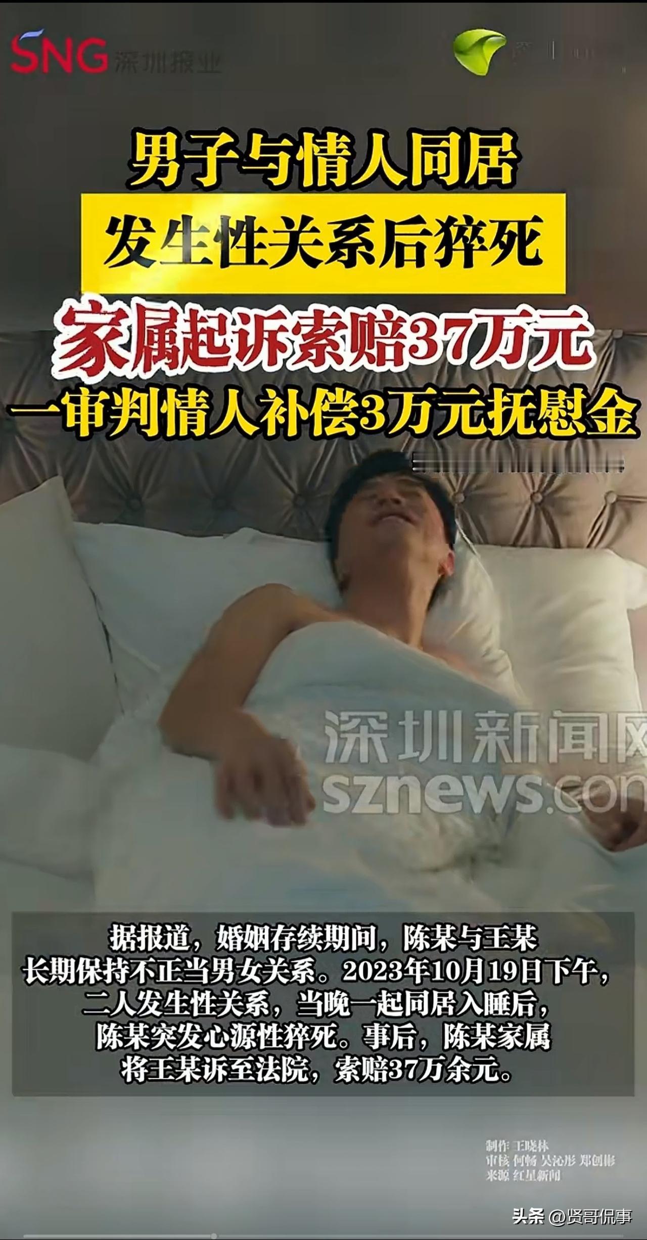 “自古奸情出人命!”安徽安庆,一男子瞒着家人与情妇在外同居,一次感冒后两人发生关系,不料,男子于当晚凌晨时分突发疾病猝亡。事后,男子家属悲痛欲绝,遂将情妇告上法庭,索赔370000元,法院判了。 据深圳新闻网11月17日消息,2023年8月起,男子陈某便背着家庭在外和情妇王某同居。 然而,好景不长,当年10月,陈某身体出了状况,感冒咳嗽还发烧,前前后后王某都陪着他去诊所看病挂水。 可陈某病情尚未痊愈,就向王某提出了要求,两人发生了关系。 当天夜里零时左右,陈某疾病发作,王某叫来儿子一起对他施救,并拨打了急救电话。 但最终,陈某还是因抢救无效离世。 经医院诊断,陈某死因是心源性猝死。 消息传到陈某妻儿耳中,她们悲痛万分。 一方面,她们对陈某的背叛行为感到震惊;另一方面,更多的是为陈某的突然离世而伤心。 为陈某办完丧事后,家属腾出时间找王某讨说法,并分两次向法院起诉,要求王某返还陈某此前给她的31万元财产,并赔偿37万元损失。 说实话,这事看起来实在荒唐。 一个有家室的男人,背着家人在外胡搞,结果把自己的命搭进去了,让家人悲痛之余,还要处理他留下的一堆麻烦,让人无语。 那么,此事又涉及到哪些法律问题呢? 1、陈某违背夫妻忠实义务,可能构成重婚。 陈某在已婚的情况下却出轨王某,完全违背了《民法典》规定的夫妻忠实勤勉义务。 此外,如果陈某与王某同居时是以夫妻名义。 那么,其行为涉嫌重婚罪,依法应受刑事处罚。 如今陈某已死,追究刑责只能作罢。 2、如果陈某向王某给付财产属实,王某应返还。 《民法典》明确规定,夫妻对共同财产有同等处置权,一方不得擅自处置大额财产。 本案中,陈某和王某的行为违背公序良俗,为人不齿。 若陈某未经妻子同意,私自将夫妻共同财产给王某,其行为无效。 王某应向陈某妻子返还财产。 法院最终认定陈某赠与王某3万余元的行为无效,王某需返还。 3、那么,王某要对陈某的死亡负责吗? 《民法典》规定,当事人因过错导致损害结果发生,应承担侵权责任。 经查,陈某系心源性猝死,此前还做过胰腺疾病手术,且当时有感冒症状。 据王某称,陈某发病时,她们尽力施救。 而现有证据无法证明陈某死亡与王某有因果关系。 对陈某来说,他作为成年有家室的人,应对自身健康负责。 当然,王某明知陈某有家庭,仍违背公序良俗与其同居,导致陈某死亡,给其家属带来伤害。 基于此,王某应适当承担陈某家属的精神损失。 综上,法院最终依法判定,王某补偿陈某家属3万元精神损失费较为合适。 俗话说,“妻贤夫祸少,夫正妻心安。” 良好的婚姻关系需要夫妻相互忠诚、担当家庭责任。 若陈某一开始对家庭和妻子怀有“忠”心,或许这样的悲剧就不会发生。 对此,你怎么看呢?欢迎大家在评论区留言。