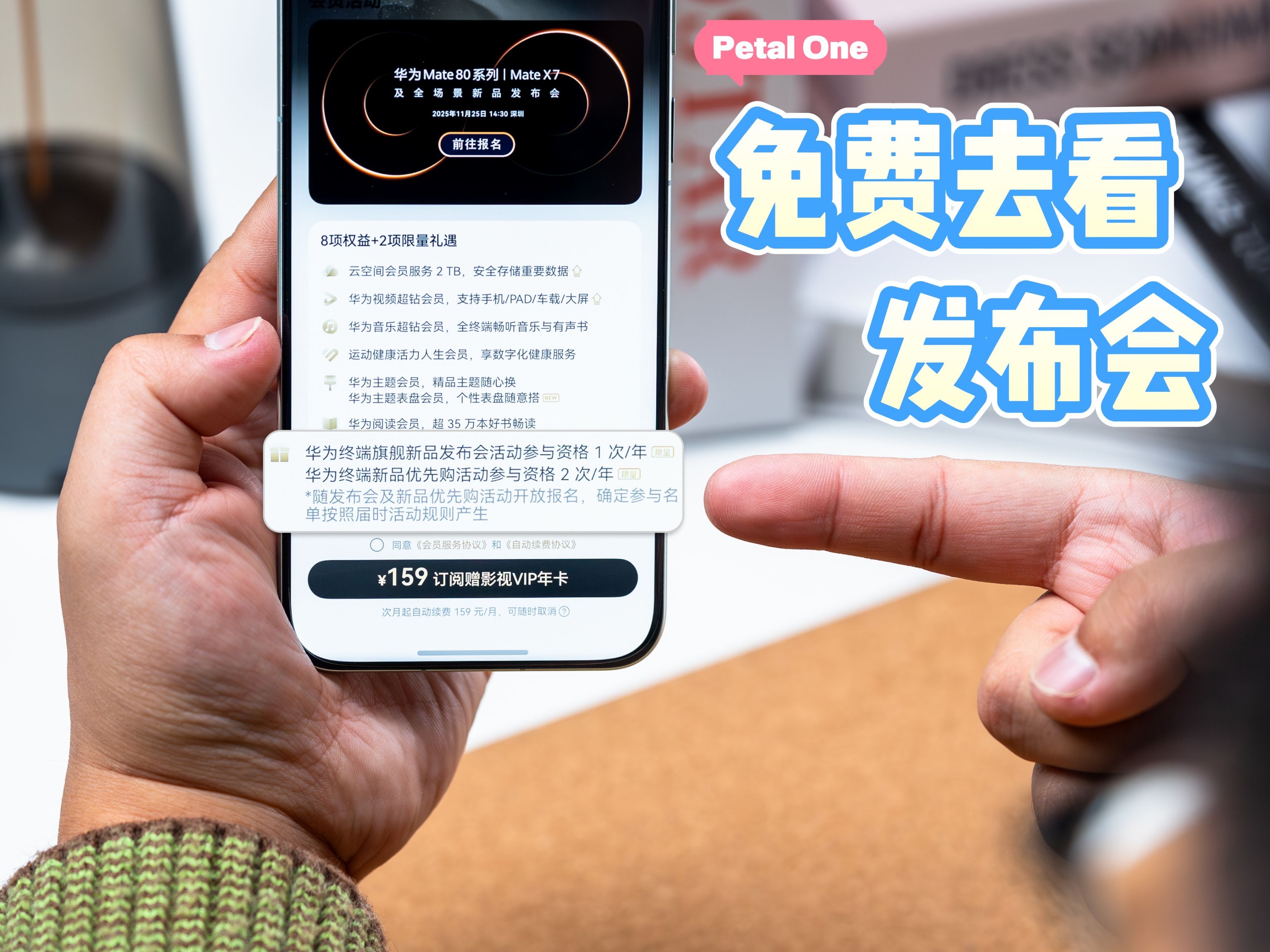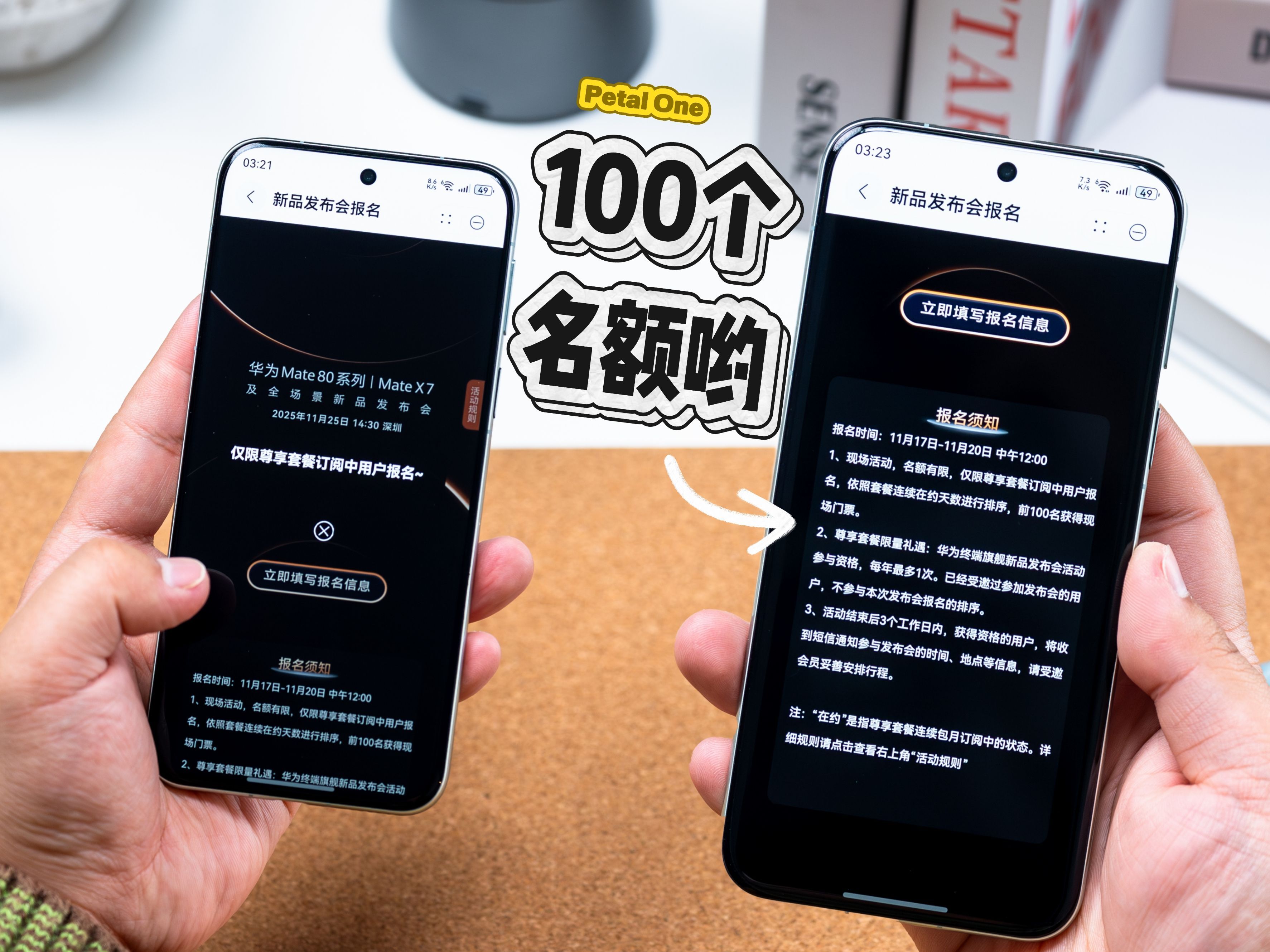 朋友们,这不华子年度旗舰「华为Mate 80系列|Mate X7及全场景新品发布会」已经官宣了,11月25日正式发布,我猜你们是不是也想亲临现场抢先体验新机。怎么才能get现场门票呢?Petal One尊享套餐里面每年一次的“华为终端旗舰新品发布会参与资格”专属权益了解下,能直接报名赢取现场名额你敢信,这波福利真的太香!Petal One尊享会员们,想去发布会现场的,去负一屏搜切换到尊享套餐页面,11月17日~20日中午12点前,填上报名信息,就等待官宣信息吧!有100个参会名额,被抽中去现场的小伙伴在我评论区留个言,咱们现场见!升级鸿蒙5.1及以上的用户别忘了去负一屏领