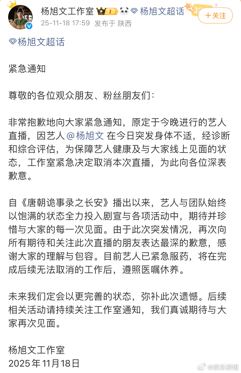 杨旭文工作室道歉:"因艺人 在今日突发身体不适,为保障艺人健康及与大家线上见面的状态,工作室紧急决定取消本次直播,为此向各位深表歉意。" 没事,身体健康最重要,注意休息,祝早日康复!下次见!