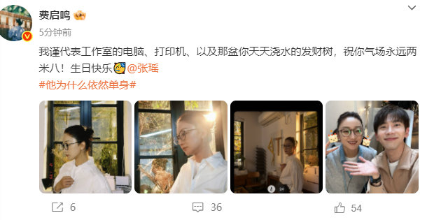 费启鸣晒合照为张瑶庆生!两人之间的友谊或工作伙伴关系。祝你气场永远两米八!生日快乐🥳张瑶