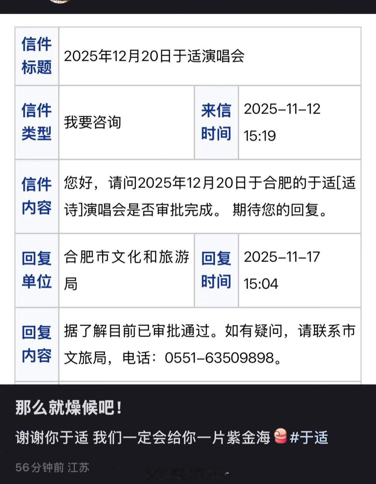 啊?于适真的要在合肥开演唱会了嘛?等一个官宣