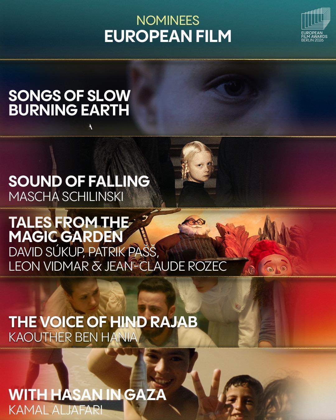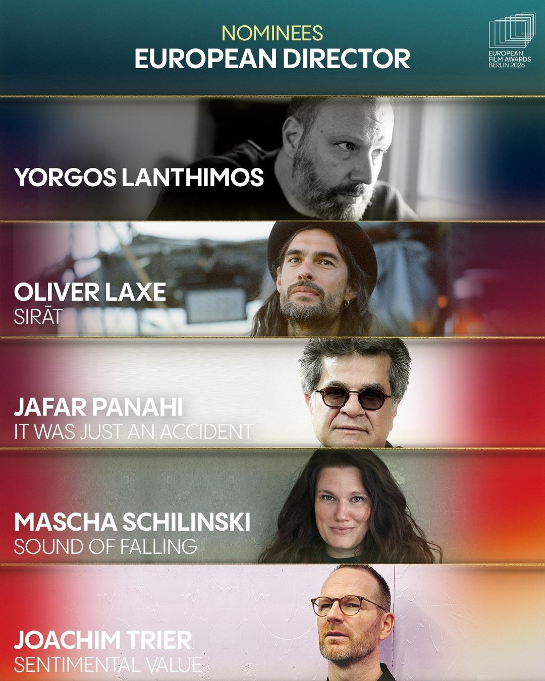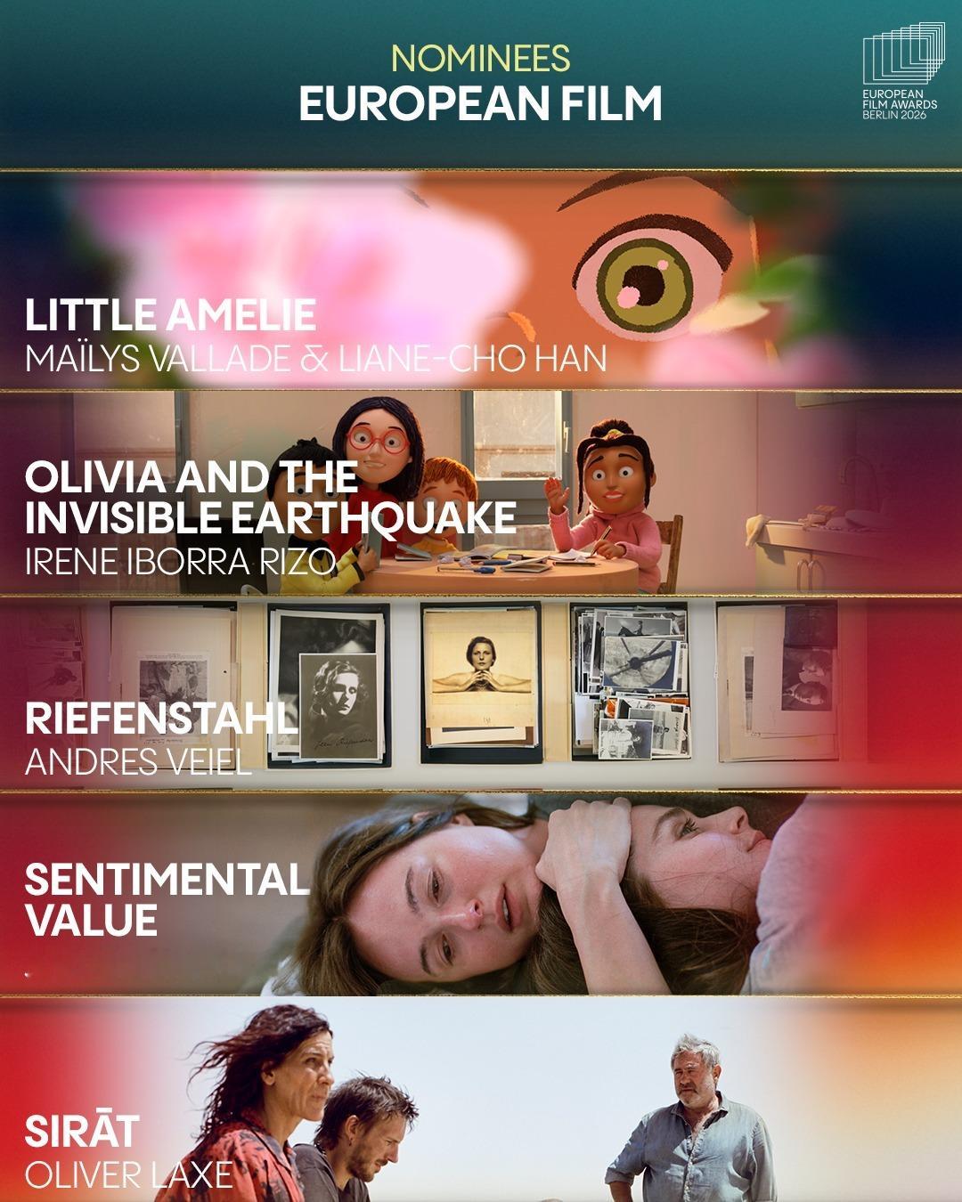 第38届公布提名名单,在今年戛纳电影节获得评审团大奖的影片《情感价值》以5项提名领跑,今年戛纳电影节评审团奖的获奖影片《接近终点》则以4项提名紧随其后,戛纳金棕榈影片《普通事故》与另一部戛纳评审团奖影片《望向太阳》均获3项提名跻身前三甲。本届欧洲电影奖颁奖典礼将于2026年1月17日在德国柏林举行。以下为提名名单↓ ↓ ↓第38届欧洲电影奖提名名单最佳欧洲影片《普通事故》《情感价值》《接近终点》《望向太阳》《欣德·拉贾布之声》《孤寂午后》《邓南遮占领阜姆自由邦》《里芬施塔尔》《战火悲歌》《哈桑在加沙》《彩虹》《犬神》《你好,爱美丽》《奥利维亚与无声震波》《奶奶身后事》最佳纪录片《孤寂午后》《邓南遮占领阜姆自由邦》《里芬施塔尔》《战火悲歌》《哈桑在加沙》最佳动画片《彩虹》《犬神》《你好,爱美丽》《奥利维亚与无声震波》《奶奶身后事》最佳导演欧格斯·兰斯莫斯《拯救地球》贾法·帕纳西《普通事故》约阿希姆·提尔《情感价值》奥利维尔·拉克谢《接近终点》玛莎·施林斯基《望向太阳》最佳男演员伊丹·威斯《弗朗茨》托尼·塞尔维洛《恩典》斯特兰·斯卡斯加德《情感价值》塞尔希·洛佩斯《接近终点》麦斯·米科尔森《最后的维京人》最佳女演员蕾雅·德吕盖《137号案件》瓦莱丽亚·布鲁尼·泰德斯基《杜塞》莉奥尼·贝尼希《夜班》薇姬·克里普斯《柔情挚我》雷娜特·赖因斯夫《情感价值》最佳剧本《普通事故》《恩典》《情感价值》《接近终点》《望向太阳》最佳首作(欧洲发现费比西奖)《女孩,你怎么了?》《父影之下》《坠落》《该死的赫梅》《桑拿》《灰色天空下》欧洲青少年观众奖《彩虹》《我不小心写了一本书》《成年练习曲》