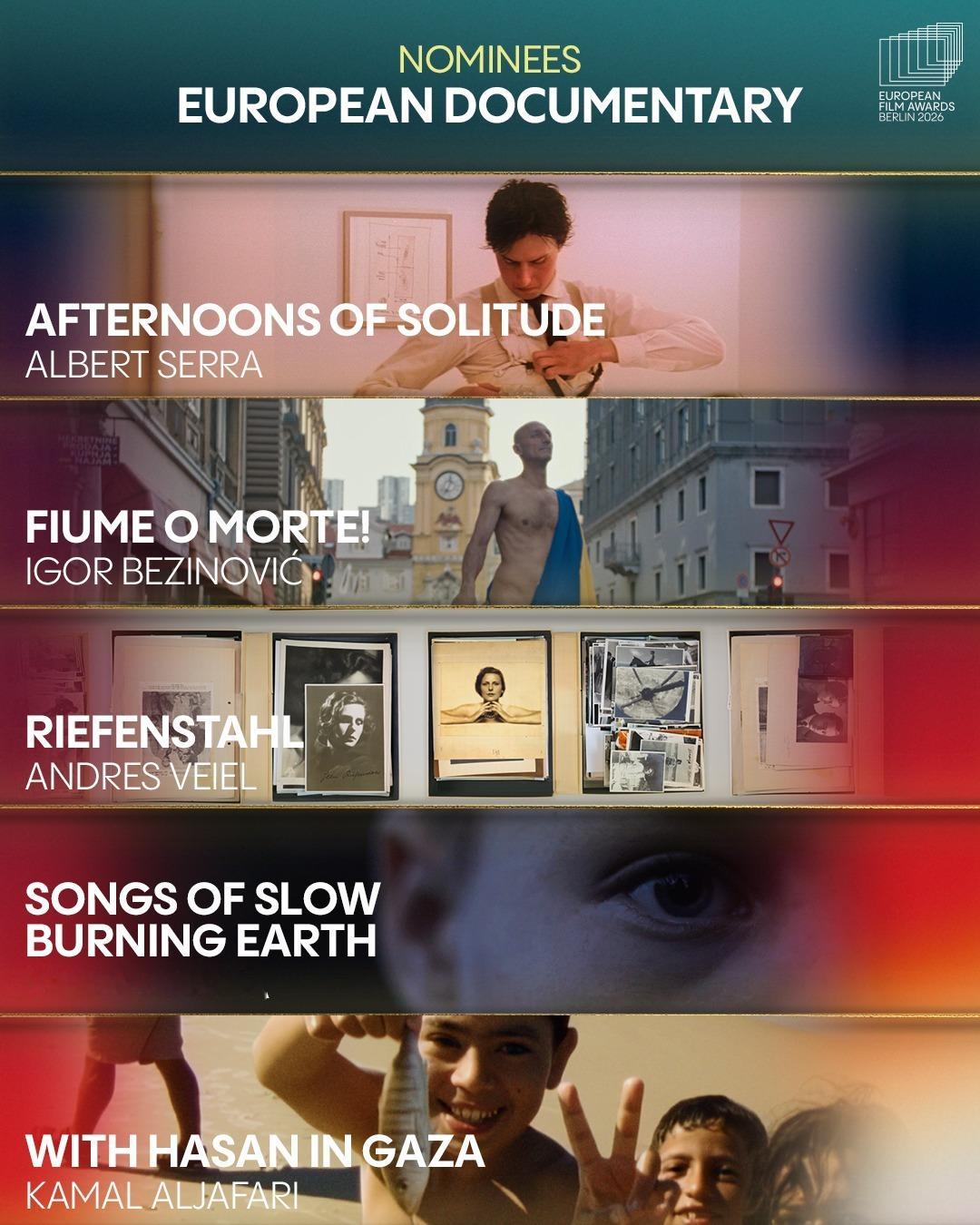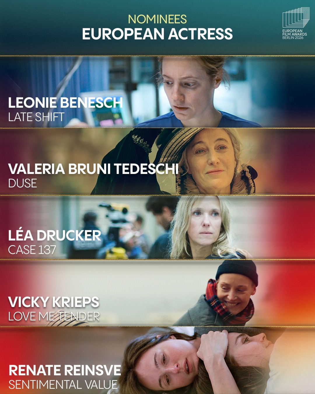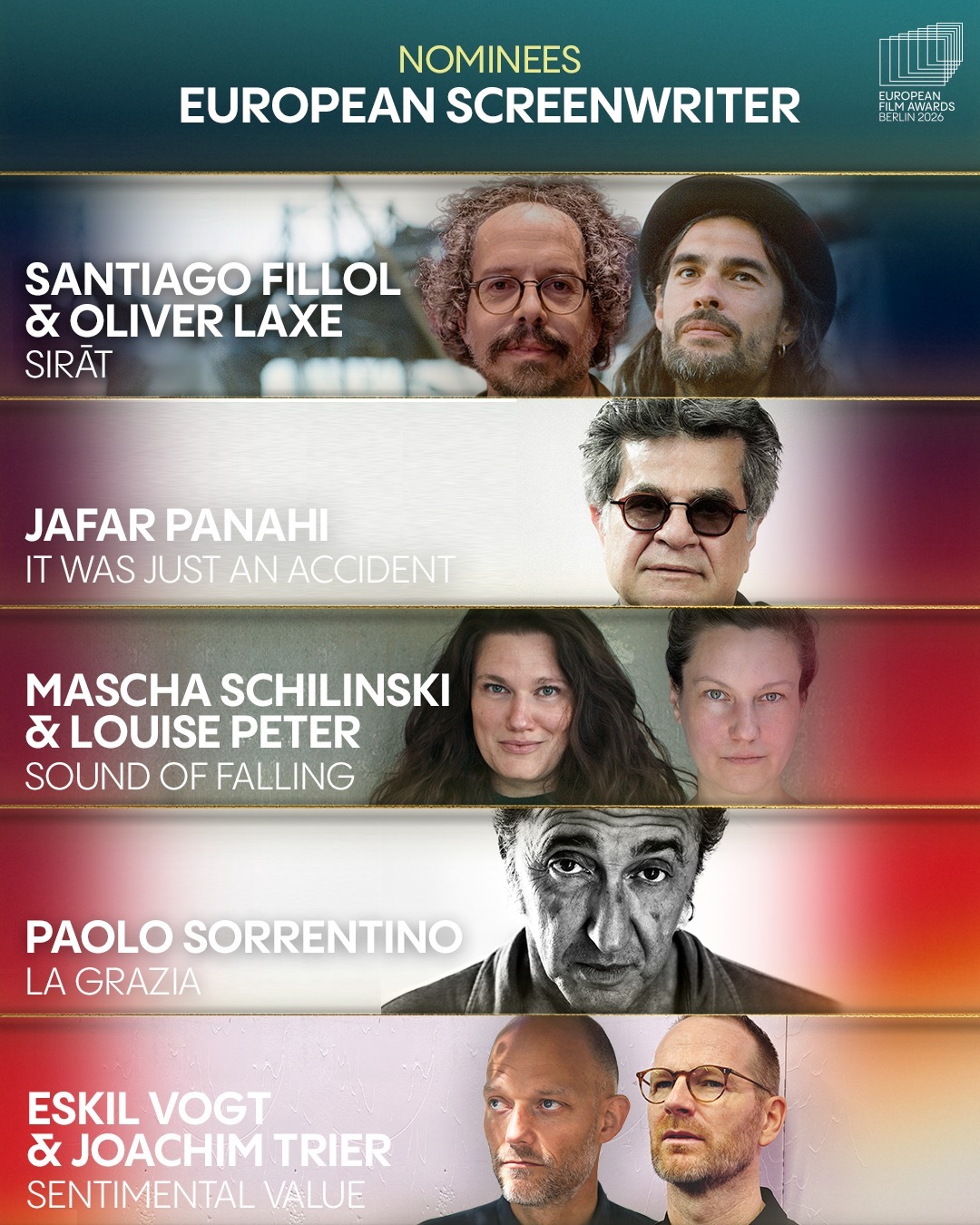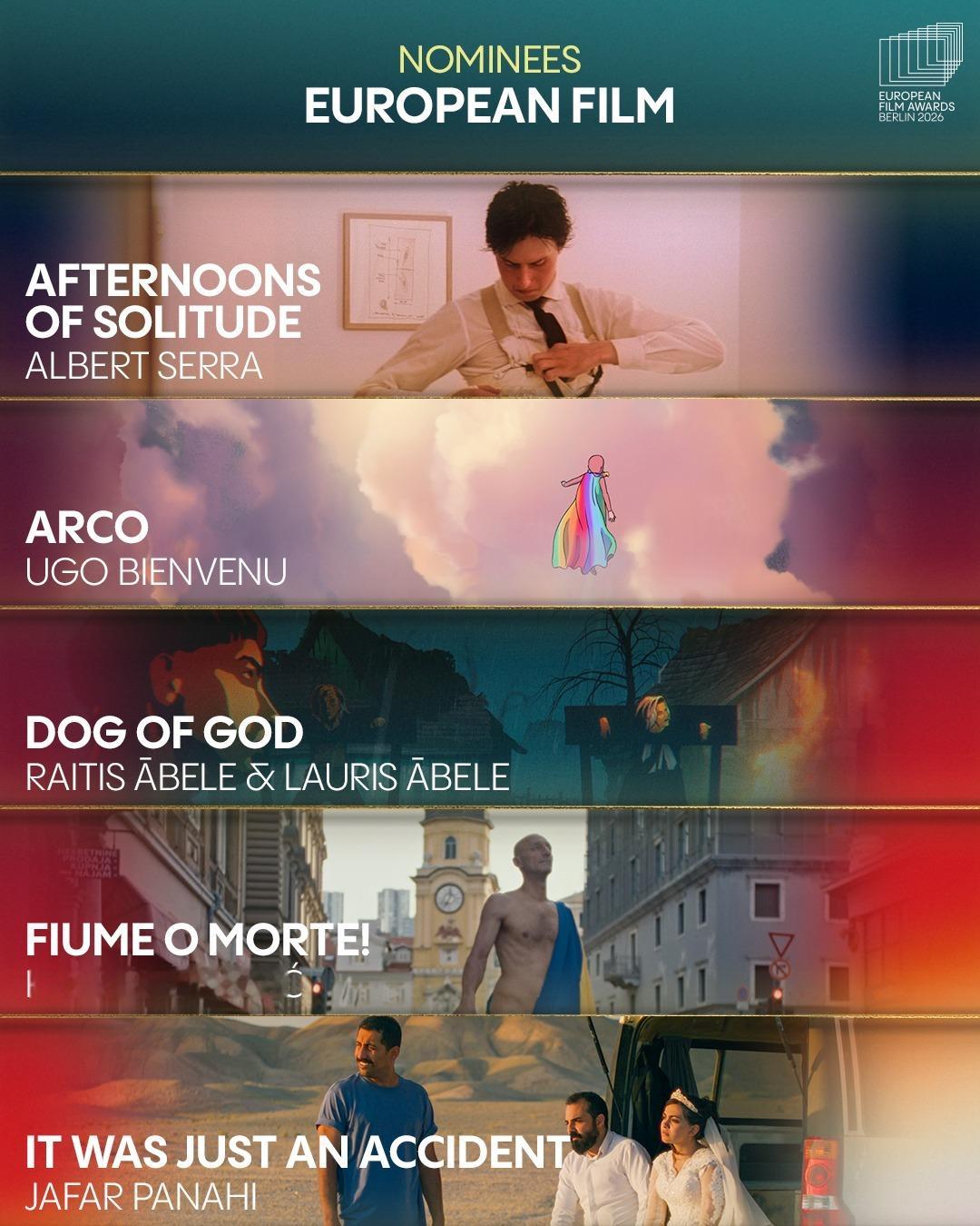 第38届公布提名名单,在今年戛纳电影节获得评审团大奖的影片《情感价值》以5项提名领跑,今年戛纳电影节评审团奖的获奖影片《接近终点》则以4项提名紧随其后,戛纳金棕榈影片《普通事故》与另一部戛纳评审团奖影片《望向太阳》均获3项提名跻身前三甲。本届欧洲电影奖颁奖典礼将于2026年1月17日在德国柏林举行。以下为提名名单↓ ↓ ↓第38届欧洲电影奖提名名单最佳欧洲影片《普通事故》《情感价值》《接近终点》《望向太阳》《欣德·拉贾布之声》《孤寂午后》《邓南遮占领阜姆自由邦》《里芬施塔尔》《战火悲歌》《哈桑在加沙》《彩虹》《犬神》《你好,爱美丽》《奥利维亚与无声震波》《奶奶身后事》最佳纪录片《孤寂午后》《邓南遮占领阜姆自由邦》《里芬施塔尔》《战火悲歌》《哈桑在加沙》最佳动画片《彩虹》《犬神》《你好,爱美丽》《奥利维亚与无声震波》《奶奶身后事》最佳导演欧格斯·兰斯莫斯《拯救地球》贾法·帕纳西《普通事故》约阿希姆·提尔《情感价值》奥利维尔·拉克谢《接近终点》玛莎·施林斯基《望向太阳》最佳男演员伊丹·威斯《弗朗茨》托尼·塞尔维洛《恩典》斯特兰·斯卡斯加德《情感价值》塞尔希·洛佩斯《接近终点》麦斯·米科尔森《最后的维京人》最佳女演员蕾雅·德吕盖《137号案件》瓦莱丽亚·布鲁尼·泰德斯基《杜塞》莉奥尼·贝尼希《夜班》薇姬·克里普斯《柔情挚我》雷娜特·赖因斯夫《情感价值》最佳剧本《普通事故》《恩典》《情感价值》《接近终点》《望向太阳》最佳首作(欧洲发现费比西奖)《女孩,你怎么了?》《父影之下》《坠落》《该死的赫梅》《桑拿》《灰色天空下》欧洲青少年观众奖《彩虹》《我不小心写了一本书》《成年练习曲》