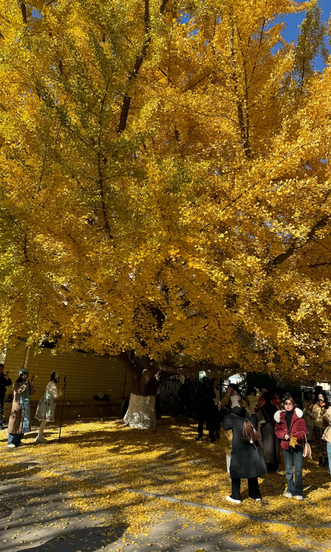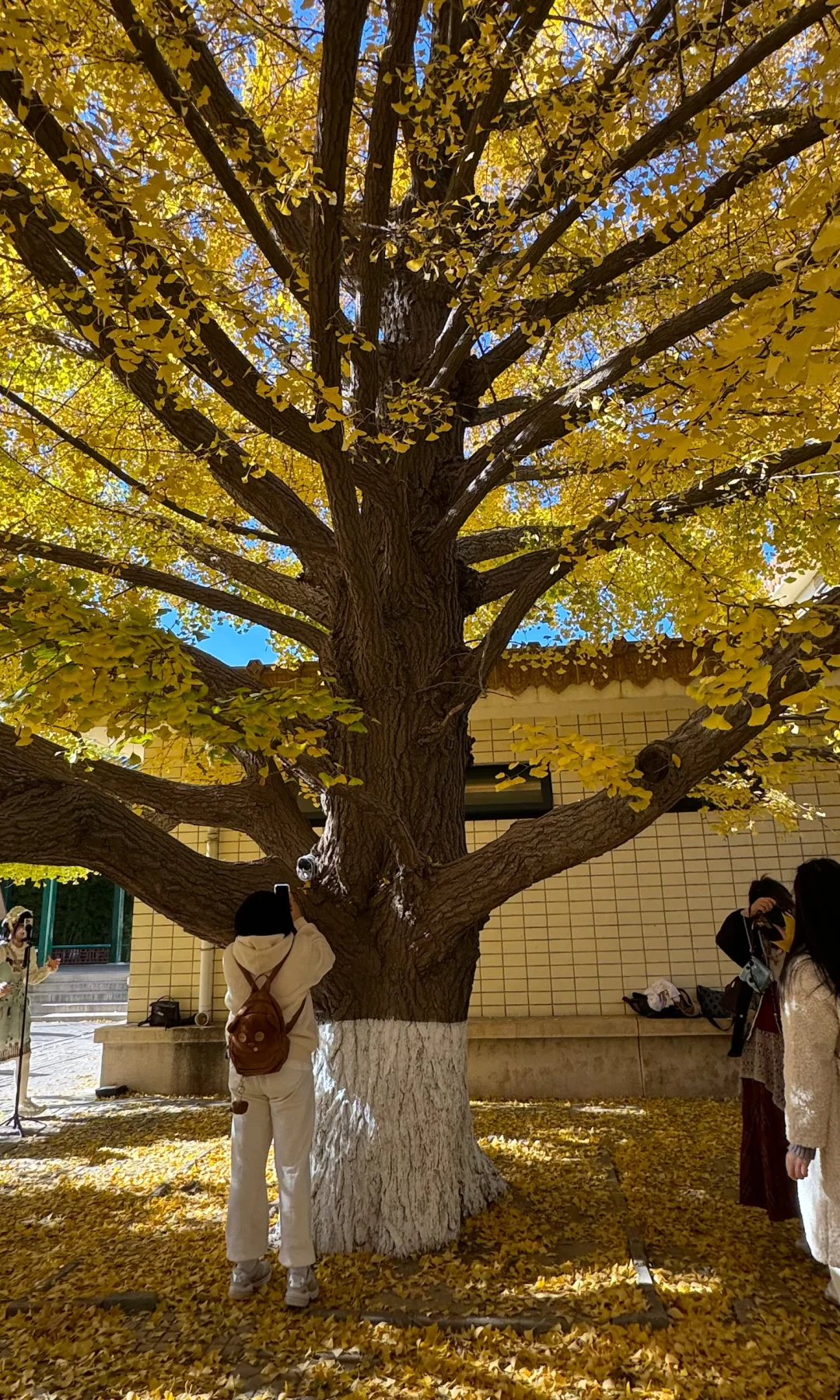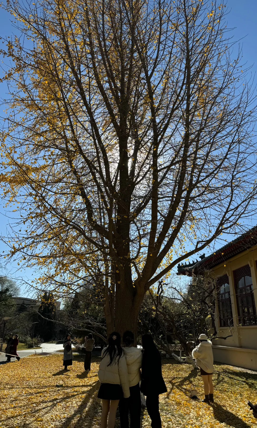 我周五早上去的时候 农展馆还有不少树还有挺多叶子的 今天中午又去了下 只剩下这棵最大的还有叶子 周五还一点没掉,这会掉了30% 今天风太大了,希望能抗住 加上降温,最多3天了 也算是目前北京最大最浓密的银杏了 今天天气不错,可冲。 还可以看到银杏雨(其实没太黄透)