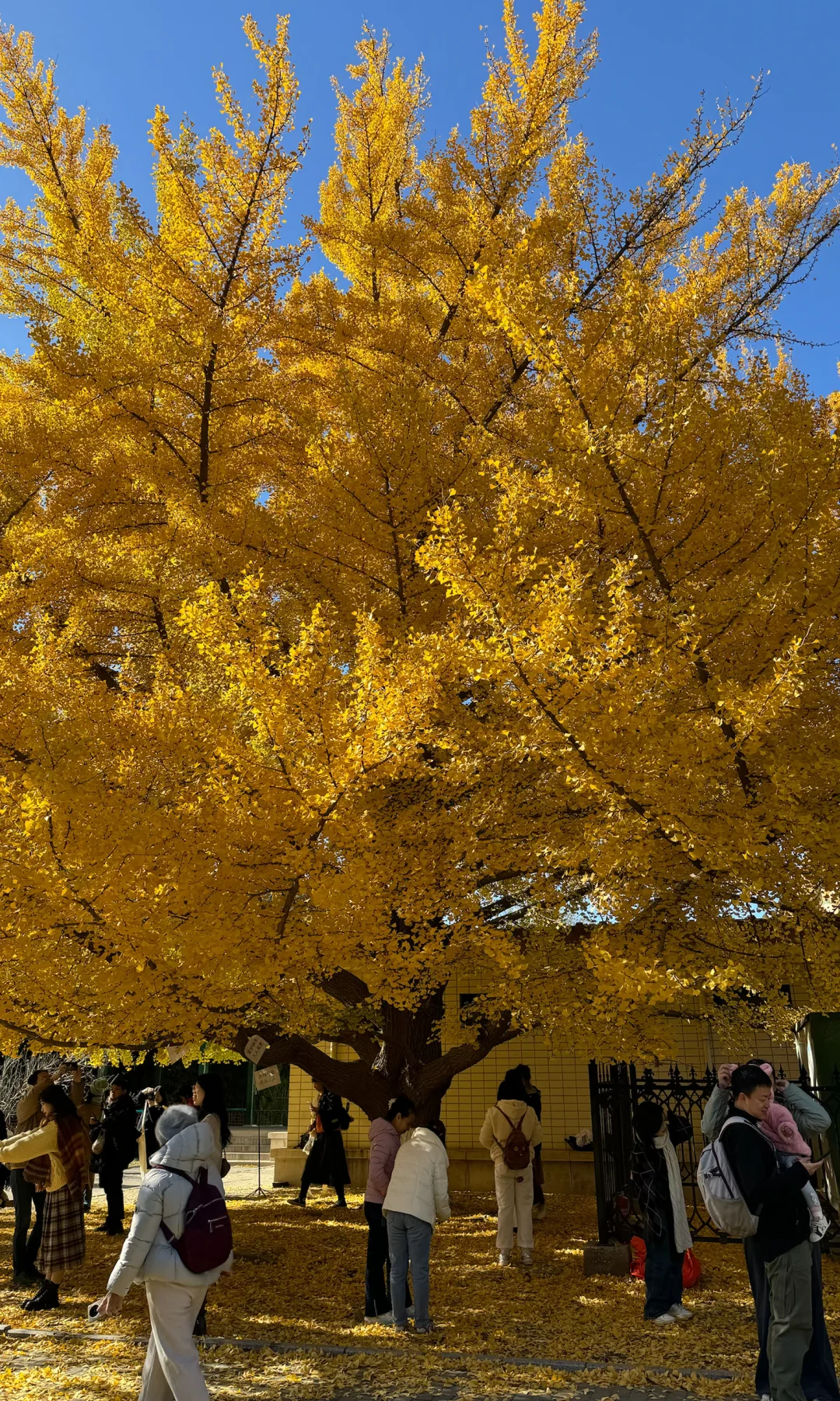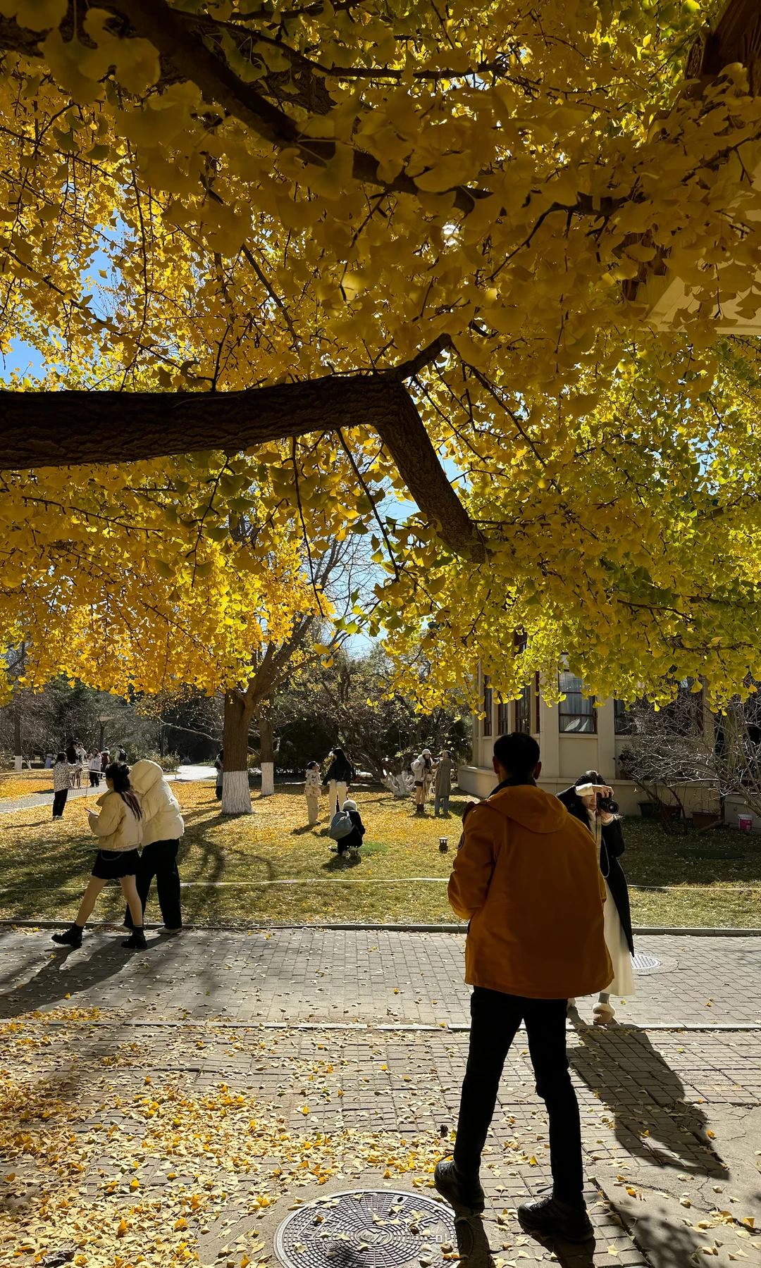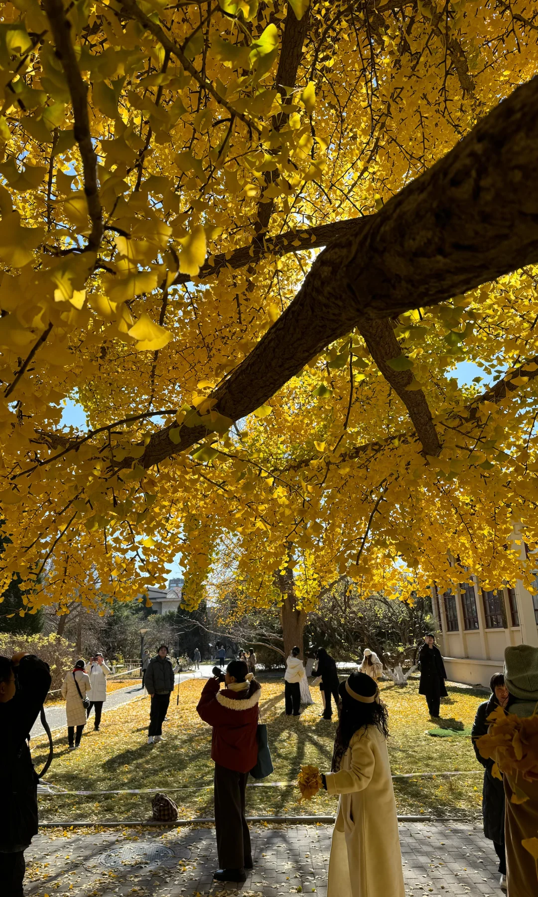我周五早上去的时候 农展馆还有不少树还有挺多叶子的 今天中午又去了下 只剩下这棵最大的还有叶子 周五还一点没掉,这会掉了30% 今天风太大了,希望能抗住 加上降温,最多3天了 也算是目前北京最大最浓密的银杏了 今天天气不错,可冲。 还可以看到银杏雨(其实没太黄透)