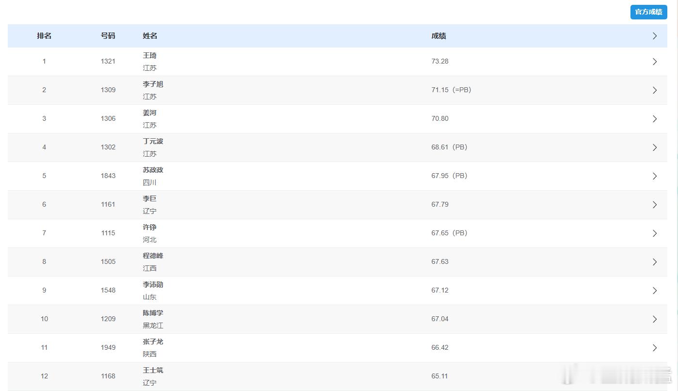 全运男子链球决战亚洲头号选手两连冠 江苏队四猛将豪迈包揽前四11月18日晚,全运会田径大项结束男子链球决赛争夺,上届全运冠军、江苏选手王琦,以73米28的成绩,成功赢得两连冠。江苏队在男子链球上抢足吸精度,参赛的四名队员包揽前四。20岁小将李子旭以71米15获得亚军,平个人最佳;姜河以70米80获得季军,丁远波68米61获得第四,创造个人最佳。已经连续六个赛季突破72米大关的王琦,当之无愧亚洲头号选手,杭州亚运会加连续两届亚锦赛冠军。国内比赛自然更加无敌。王琦本场三次投掷超70米,都是冠军级成绩,最后以第六投的73米28夺冠凯旋。李子旭也是三次过70米,最后凭借第一投的71米15获得亚军。今年有过72米80发挥的姜河,本场手感不是最好,虽然四次过70米,但没有过71米的成绩,姜河以第六投的70米80获得季军。