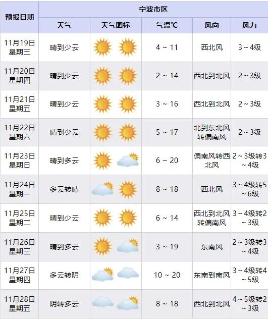 未来十天宁波晴到少云为主。最低气温今天到21日及26日2~4℃,有霜或霜冻,山区0~-2℃,有薄冰或冰冻;其余5~10℃。最高气温今天到明天及25日11~14℃,其余16~20℃。