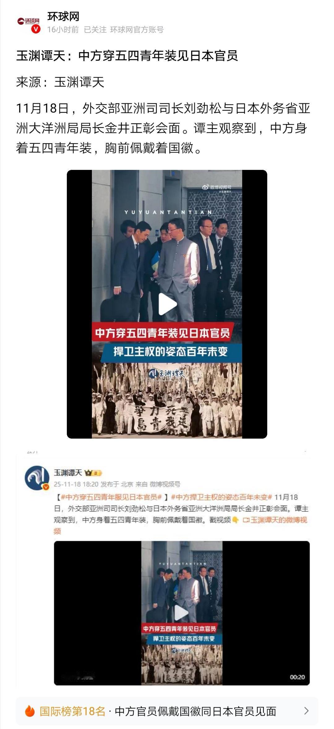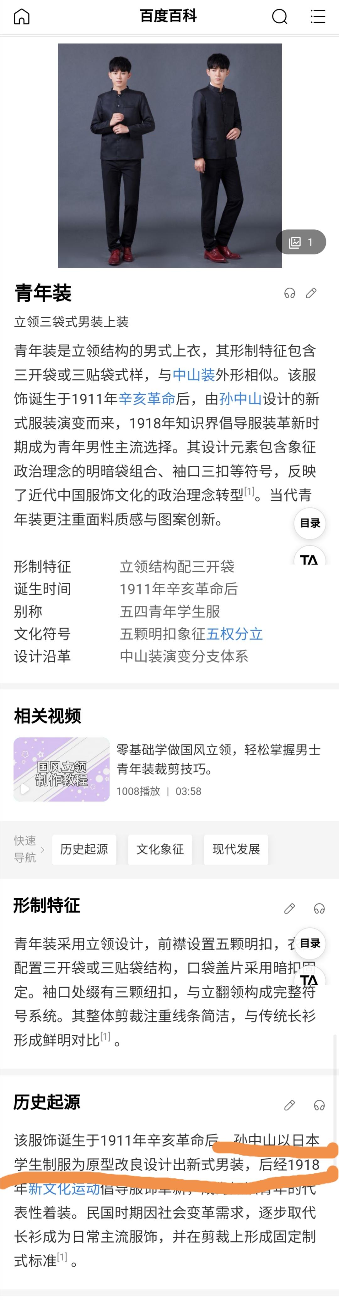 百度百科对青年装(别称“五四青年学生服”)的解释是,“该服饰诞生于1911年辛亥革命后,孙中山以日本学生制服为原型改良设计出新式男装,后经1918年新文化运动倡导服饰革新,成为知识青年的代表性着装。”在外交场合,选择穿着五四青年装,无疑具有特殊的含义。