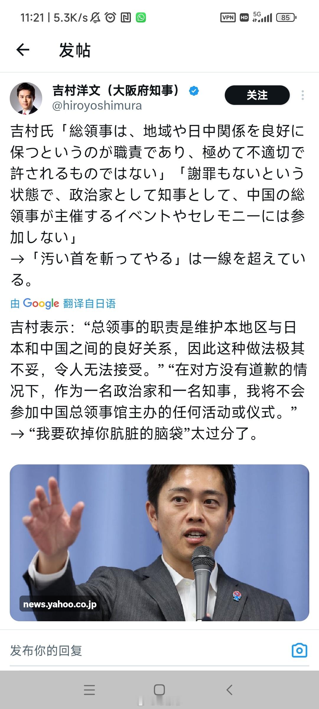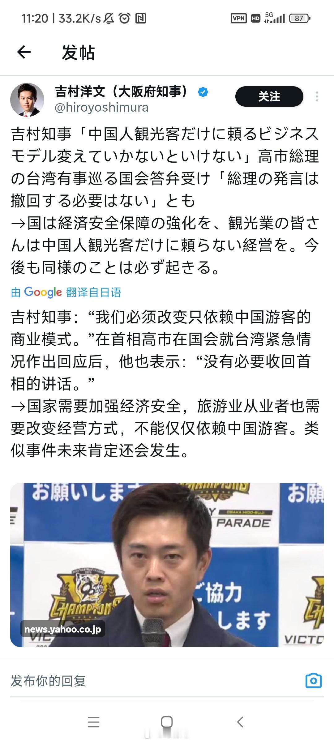 【】 日本维新会党首及大阪府知事吉村洋文在社群媒体发文:“我们必须改变只依赖中国游客的商业模式”。在高市在国会发表涉台湾言论后他表示:“没有必要收回首相的讲话。” “国家需要加强经济安全,旅游业从业者也需要改变经营方式,不能仅仅依赖中国游客。”同时,吉村还表示: “在对方没有道歉的情况下,作为一名政治家和一名知事,我将不会参加中国总领事馆主办的任何活动或仪式。” “我要砍掉你肮脏的脑袋”太过分了。 日本维新会是日本极右翼政党,代表性人物是汉奸石平。吉村是高市竞选与组阁的主要盟友,这位50岁的前律师极其反华。而该党另一位创始人就是臭名昭著的于2012年发起购买“钓鱼岛”的前东京都知事石原慎太郎。吉村的话至少说明一个问题:中国游客对日本经济太重要了。打蛇打七寸,禁止国内游客赴日旅游是“迎头痛击”的有效手段。