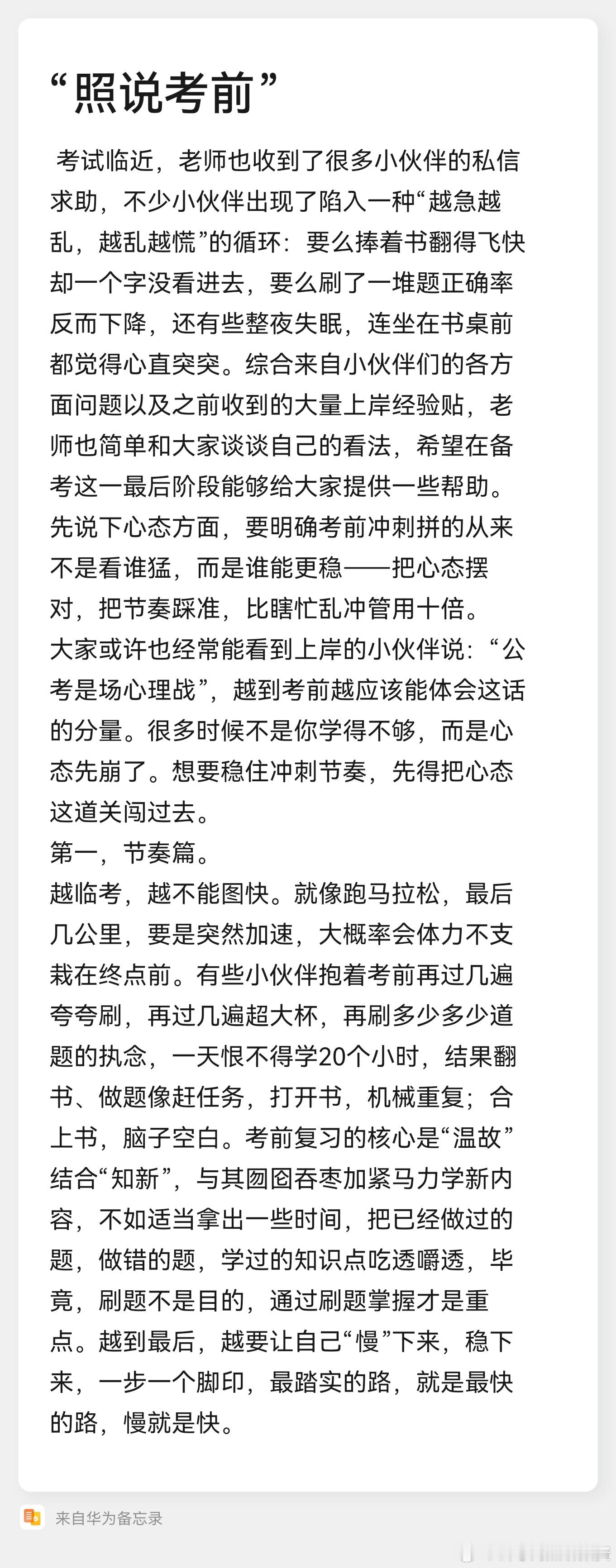 “考前聊一聊”(1)考试临近,老师也收到了很多小伙伴的私信求助,不少小伙伴出现了陷入一种“越急越乱,越乱越慌”的循环:要么捧着书翻得飞快却一个字没看进去,要么刷了一堆题正确率反而下降,还有些整夜失眠,连坐在书桌前都觉得心直突突。综合来自小伙伴们的各方面问题以及之前收到的大量上岸经验贴,老师也简单和大家谈谈自己的看法,希望在备考这一最后阶段能够给大家提供一些帮助。先说下心态方面,要明确考前冲刺拼的从来不是看谁猛,而是谁能更稳——把心态摆对,把节奏踩准,比瞎忙乱冲管用十倍。大家或许也经常能看到上岸的小伙伴说:“公考是场心理战”,越到考前越应该能体会这话的分量。很多时候不是你学得不够,而是心态先崩了。想要稳住冲刺节奏,先得把心态这道关闯过去。第一,节奏篇。越临考,越不能图快。就像跑马拉松,最后几公里,要是突然加速,大概率会体力不支栽在终点前。有些小伙伴抱着考前再过几遍夸夸刷,再过几遍超大杯,再刷多少多少道题的执念,一天恨不得学20个小时,结果翻书、做题像赶任务,打开书,机械重复;合上书,脑子空白。考前复习的核心是“温故”结合“知新”,与其囫囵吞枣加紧马力学新内容,不如适当拿出一些时间,把已经做过的题,做错的题,学过的知识点吃透嚼透,毕竟,刷题不是目的,通过刷题掌握才是重点。越到最后,越要让自己“慢”下来,稳下来,一步一个脚印,最踏实的路,就是最快的路,慢就是快。