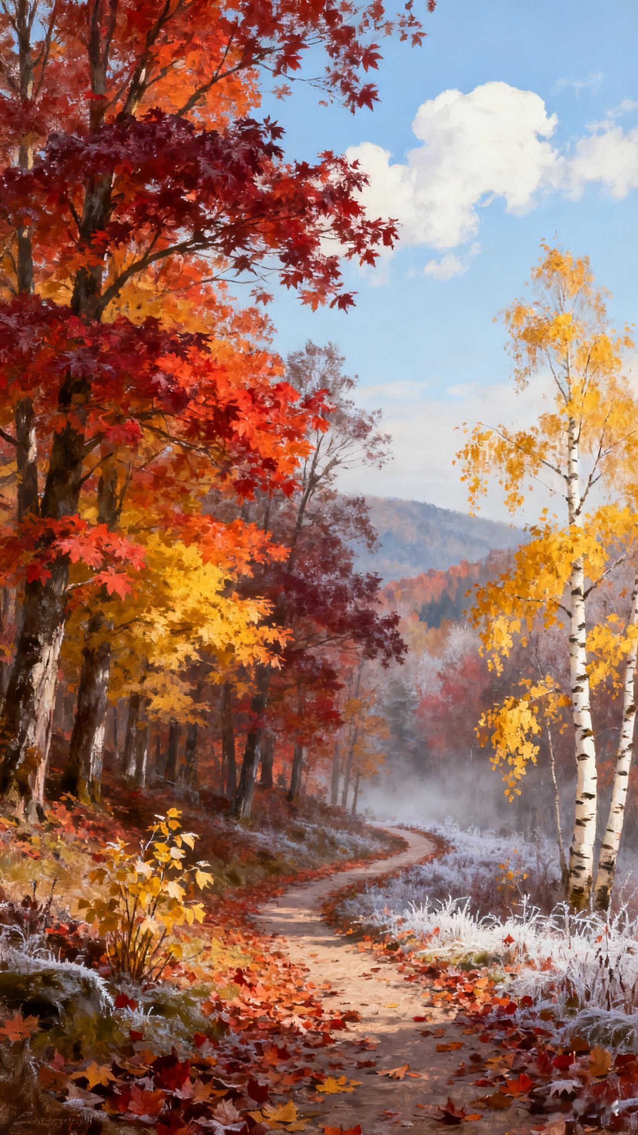晨雾是凉的,沾在指节上,裹着薄霜的草叶颤了颤,碎白落了半径。 枫枝垂着深红的掌,脉络里浸着晨阳的暖,风一摇,叶尖碰着桦树银白的皮,簌簌落些明黄的碎影。踩在叶堆上,软绵里裹着脆响,混着松针的清苦与落叶的甜香——空气是浸了秋味的酒。 远处山尖浮在云絮里,蓝得轻软。这晓径像秋铺的信笺,每片叶、每缕雾,都是写了一半的温柔。