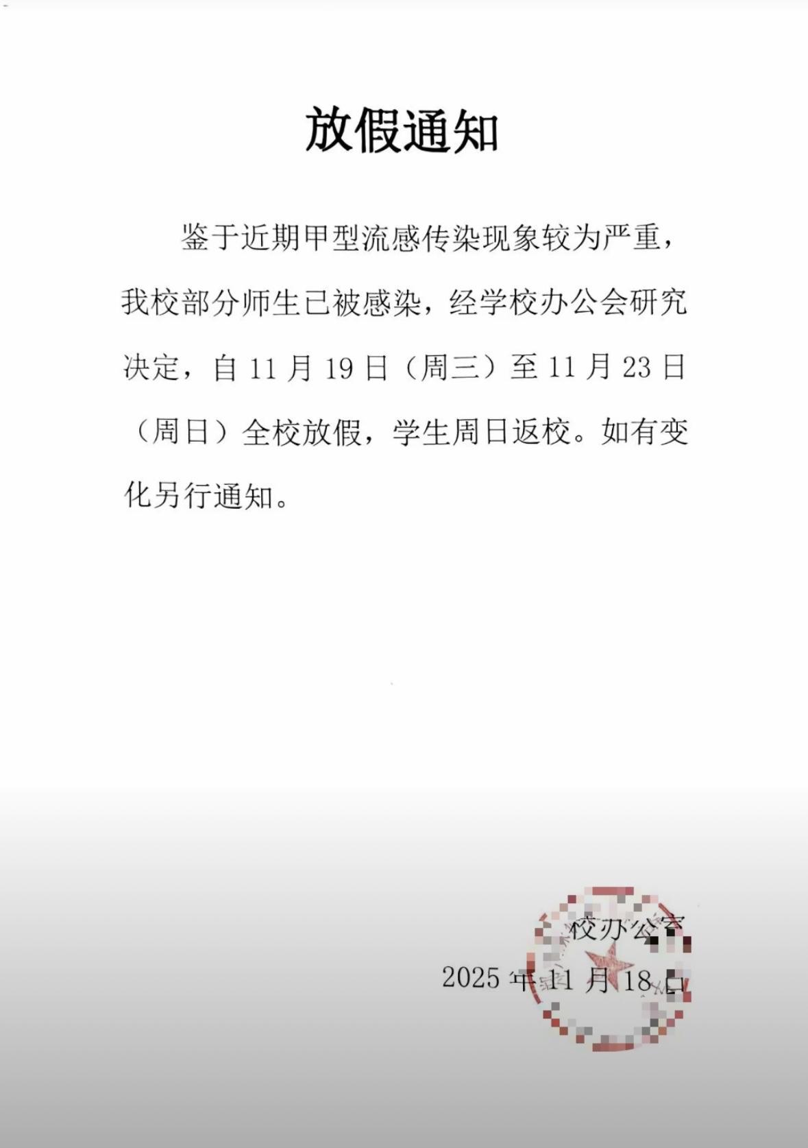 家长反映学校发文放假通知让接孩子回家休息三天,加上周末共五天。 近期甲流传染较