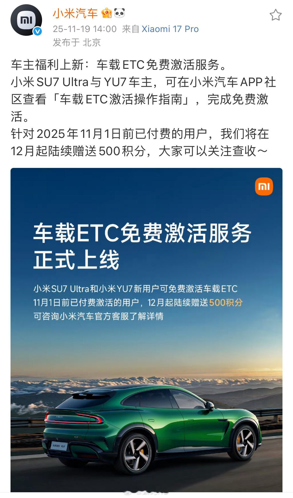 给友商上强度,小米su7Ultra和小米YU7新用户车载ETC可免费激活。