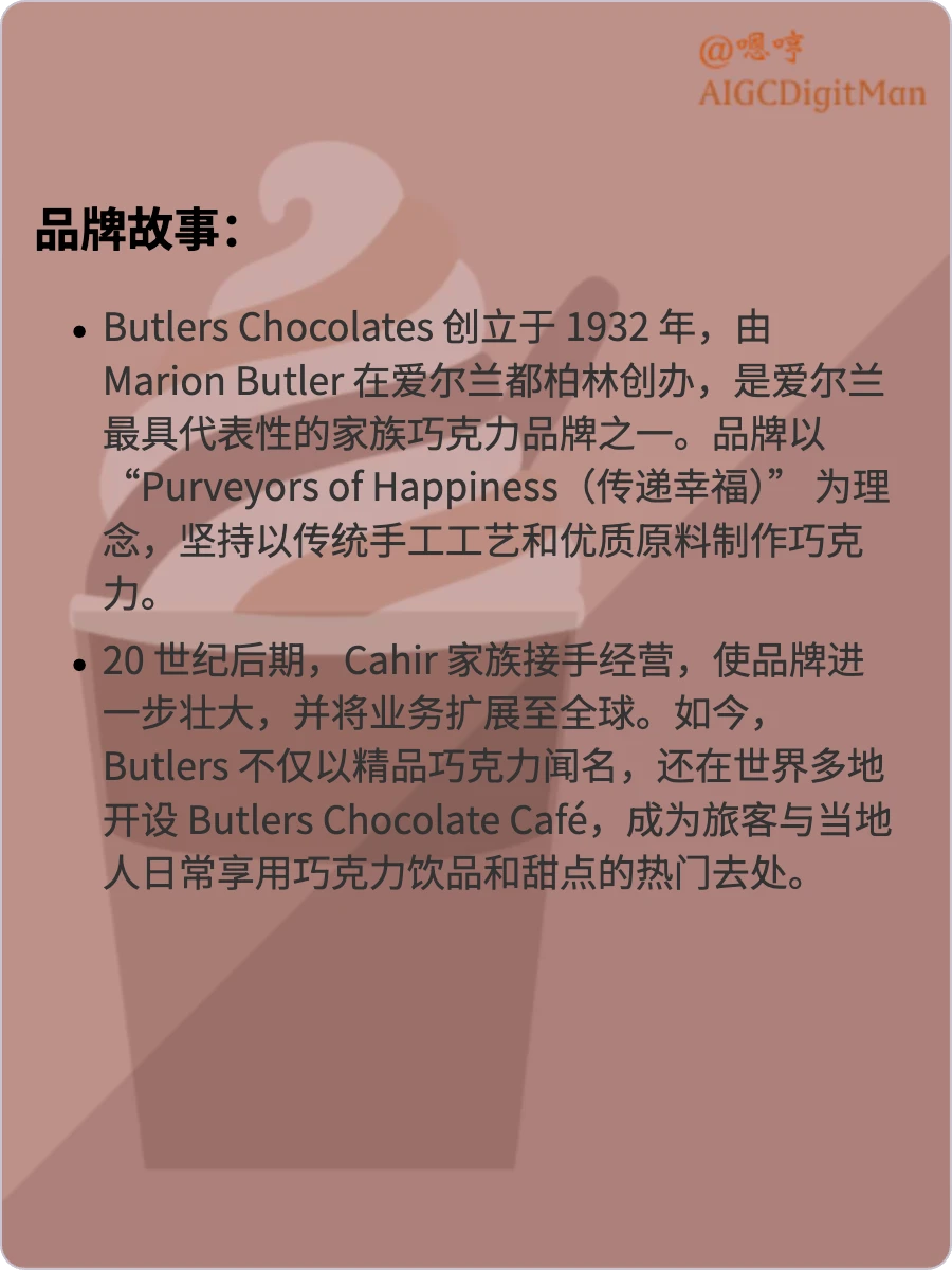 Butlers Chocolates 创立于 1932 年,由 Marion Butler 在爱尔兰都柏林创办,是爱尔兰最具代表性的家族巧克力品牌之一。