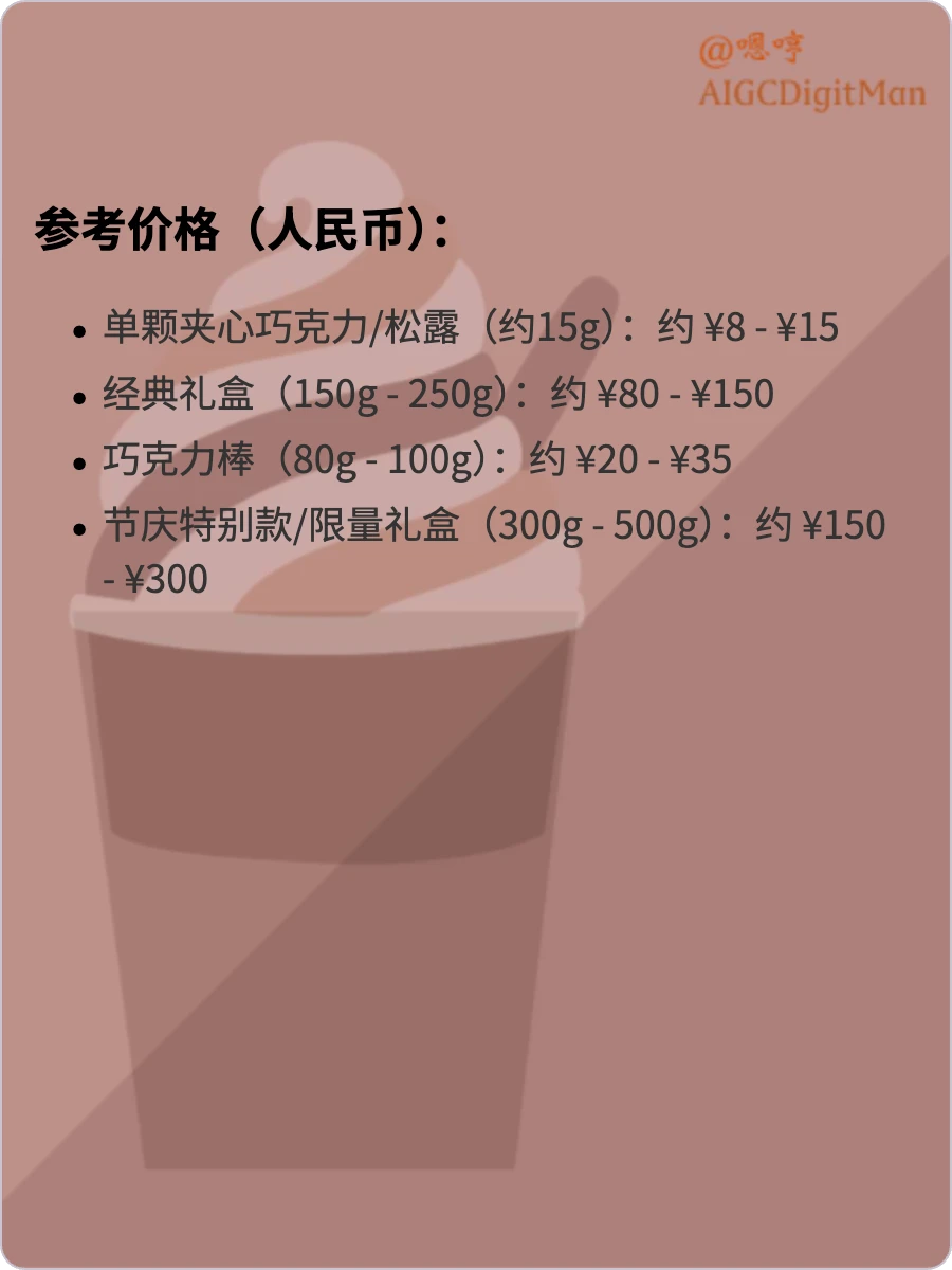 单颗夹心巧克力/松露(约15g):约 ¥8 - ¥15