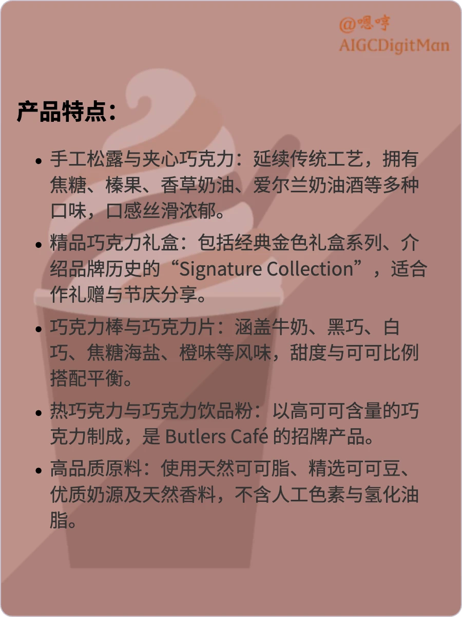 热巧克力与巧克力饮品粉:以高可可含量的巧克力制成,是 Butlers Café 的招牌产品。