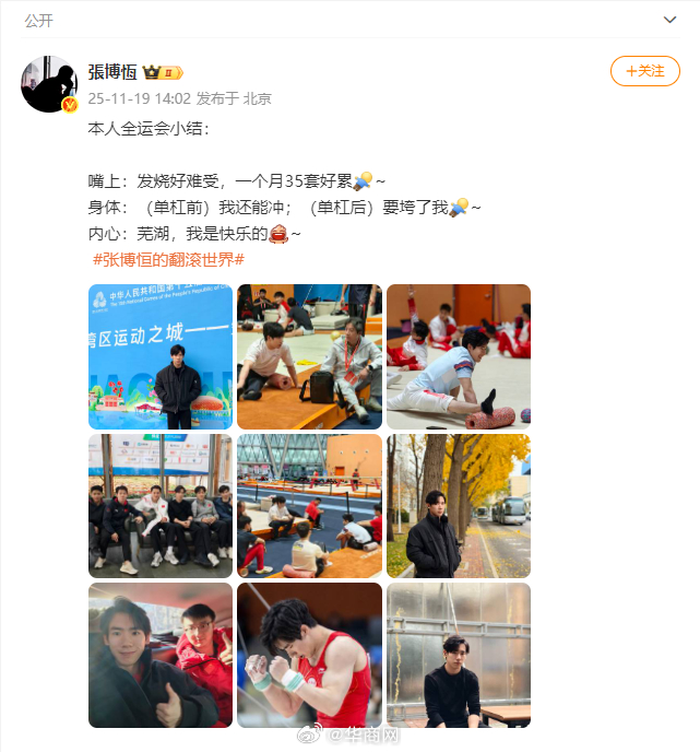 11月19日, 发文小结全运会,张博恒表示,嘴上说“发烧好难受,一个月35套好累”。身体告诉自己“(单杠前)我还能冲,(单杠后)要垮了我”。内心os“芜湖,我是快乐的”。