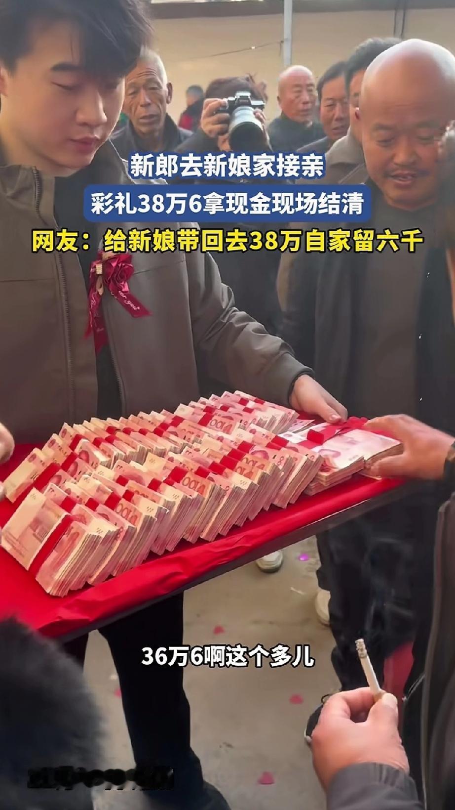 新郎去接亲当场把彩礼38万6结清,给新郎自留了6000千,38万的高额彩礼,一个普通人家有几个能拿得出,为了娶媳妇有的人家真是倾家荡产,想想两个儿子的愁死,啥时候彩礼能降下来?能让普通老百姓度过彩礼的难关,现在也许是因男多女少的缘故,也不全是很矛盾,越是底层人彩礼越高,那些高学位人士的彩礼,不但低有的甚至倒贴钱,这可能是人与人之间文化的区别吧!