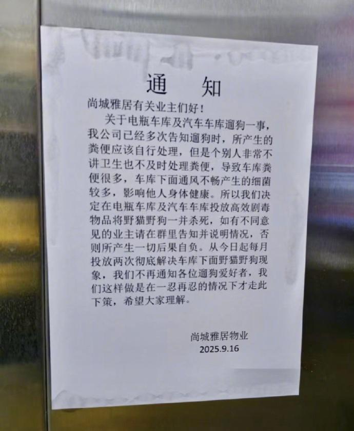 【物业回应将投毒治理不文明遛狗行为:实际未投放,警示效果不错】物业通知将投毒治理不文明遛狗行为 11月17日,有网民发帖称,江苏盐城尚城雅居小区物业张贴通知称,将在地下车库投放剧毒物品来治理遛狗不清理粪便行为,同时将毒杀野猫野狗,引发争议。对此,11月18日,小区物业负责人回应大皖新闻记者称,只是警示,实际并未投放,效果不错。 该负责人介绍,小区内长期存在业主遛狗不清理粪便、居民投喂流浪猫狗等问题,尤其是在地下车库遛狗且不清理粪便,导致车辆轮胎沾染狗尿锈蚀、居民踩踏粪便投诉频发。物业曾多次在业主群发布文明遛狗提醒,但收效甚微。无奈之下,物业才于今年9月发布了这则通知,声称将投放剧毒物品治理,实际仅是想起到警示作用,不会真的投放剧毒物品。通知发布后,效果不错,但近期因天气转冷又有复发趋势。 该负责人表示,这则通知引发关注后,属地五星街道和庆康社区也找他了解了具体情况,他一一进行了说明。 随后,针对此事,大皖新闻记者联系了属地庆康社区,工作人员表示,尚不清楚此事。五星街道办事处相关工作人员则回应称,将就此进行核实,若存在投毒行为,会依法报警处理。(大皖新闻)
