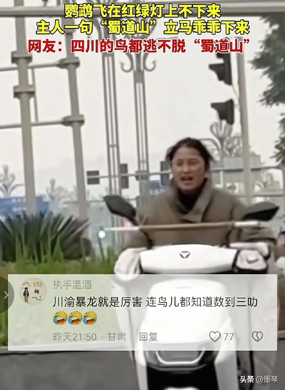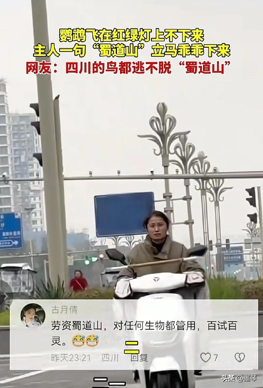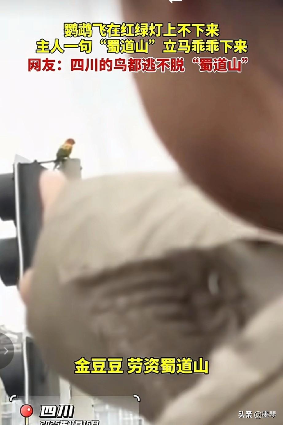 哈哈哈,笑不活了,你以为“劳资蜀到山”这句咒语仅仅是对四川男人有用吗?不,对四川的动物同样有震慑力! 本来以为这是川渝老婆管老公的“杀手锏”——一句“劳资蜀道山”,再横的四川男人都得秒变乖宝宝。 结果今天刷到个视频直接笑喷:一只鹦鹉赖在红绿灯上不肯下来,主人一句“蜀道山”,这鸟扑棱着翅膀麻溜飞下来了! 评论区川渝网友集体炸锅: “四川的生物统一被‘蜀道山’CPU了是吧?” “我家柯基听到这三个字,立马把啃了一半的拖鞋吐出来了” “建议四川动物园把‘蜀道山’设为管理员暗号,省得驯兽师费劲” 咱就是说,这三个字已经超越了“家庭口令”的范畴,成了四川生物界的“通用紧箍咒”——管你是人是鸟是猫狗,只要在四川地界,听到“蜀道山”,主打一个“一秒认怂,绝不嘴硬”。 下次去四川旅游,要是遇到峨眉山的猴子抢你包,别慌,先憋足底气喊一句“劳资蜀道山”,说不定猴子都得给你鞠个躬(bushi)。[大笑][大笑][大笑] 四川 鹦鹉