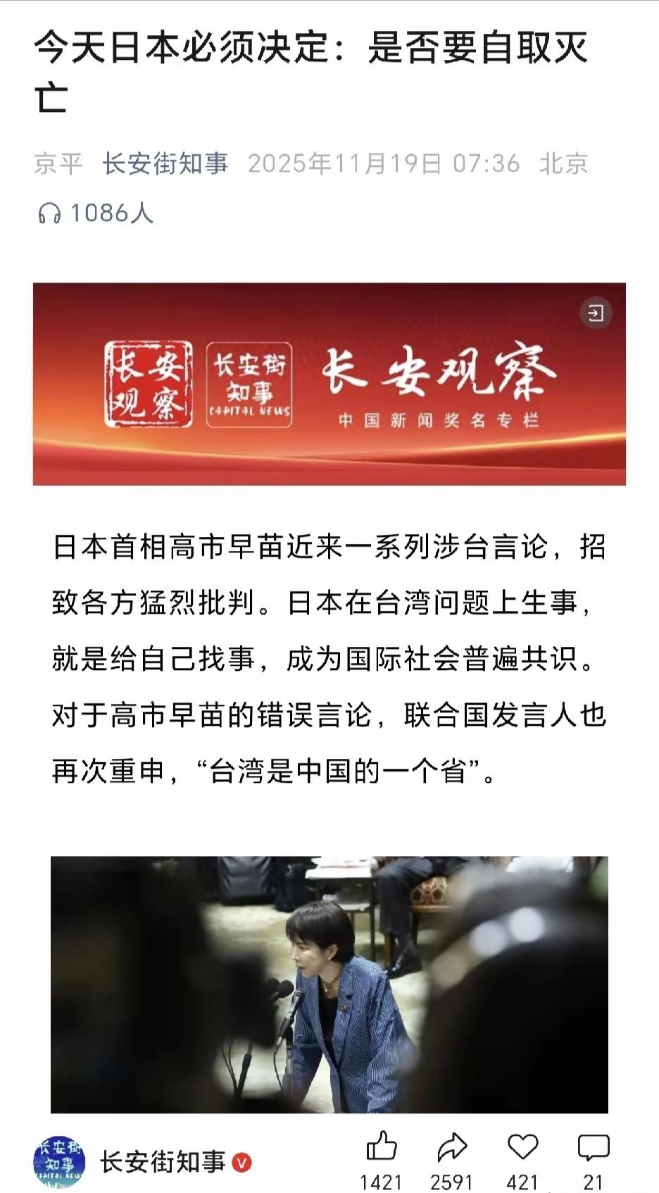 《北京日报》旗下自媒体账号“长安街知事”,11月19日发布的一篇文章标题,堪称至今为止,官方媒体最强音。 文章标题非常直截了当,“今天日本必须决定,是否要自取灭亡!” 别以为这光是口头威胁。日本军国主义经过多年的再次武装,准备因为台海问题跟解放军开战了,还要跟他客气吗? 联合国条款写的清清楚楚,一旦德国日本这些二战战败国,又对世界和平有了军事威胁,战胜国随时可以不经联合国安理会批准,直接掀桌子干他们,扫除军国主义和法西斯的威胁! 所以,“今天日本必须决定,是否要自取灭亡!”这个文章标题一点不假,现在,就到了他们必须为日本前途,做出如何选择的时候了! 日本 日本开战 日本战略改变 日本转变历史 二战后日本投降 中日关系的未来走向会如何 日本的挑衅行为是否会引发战争