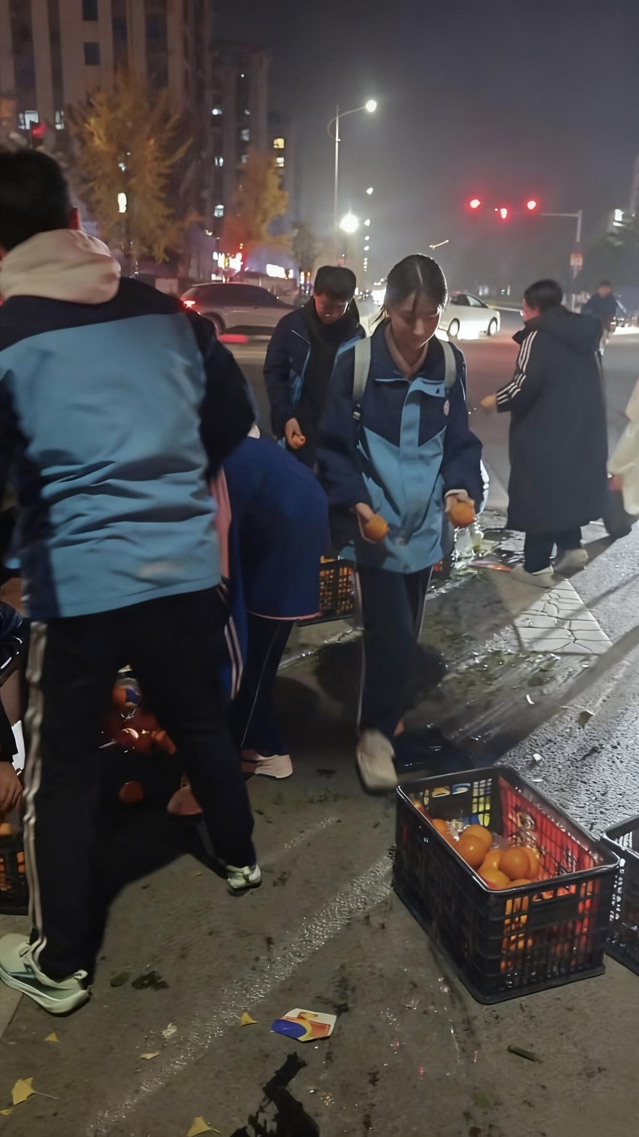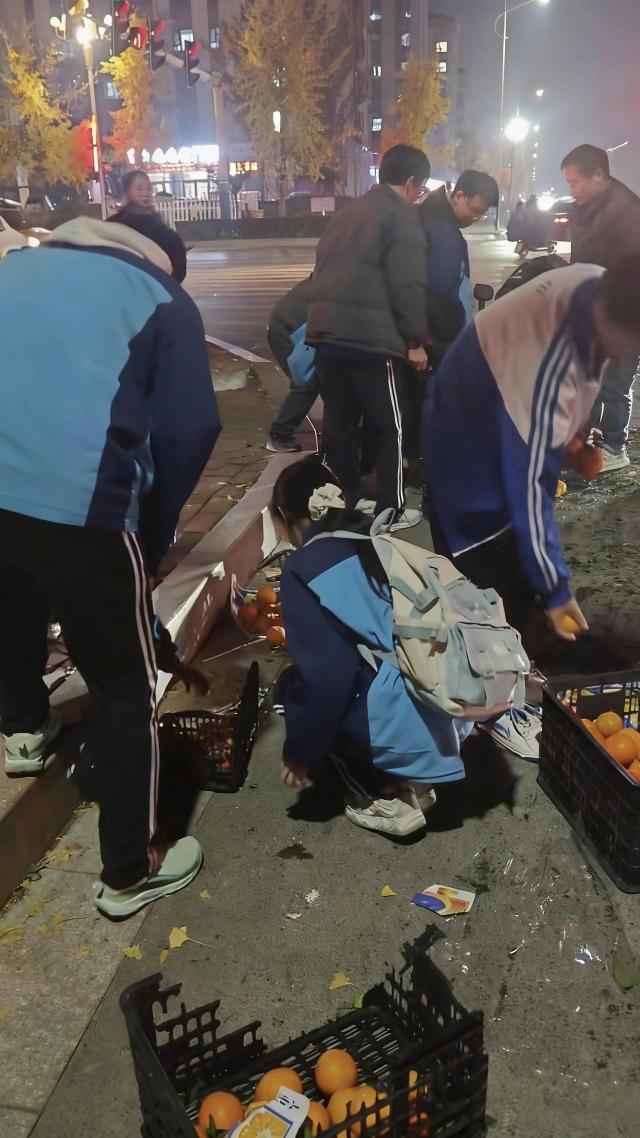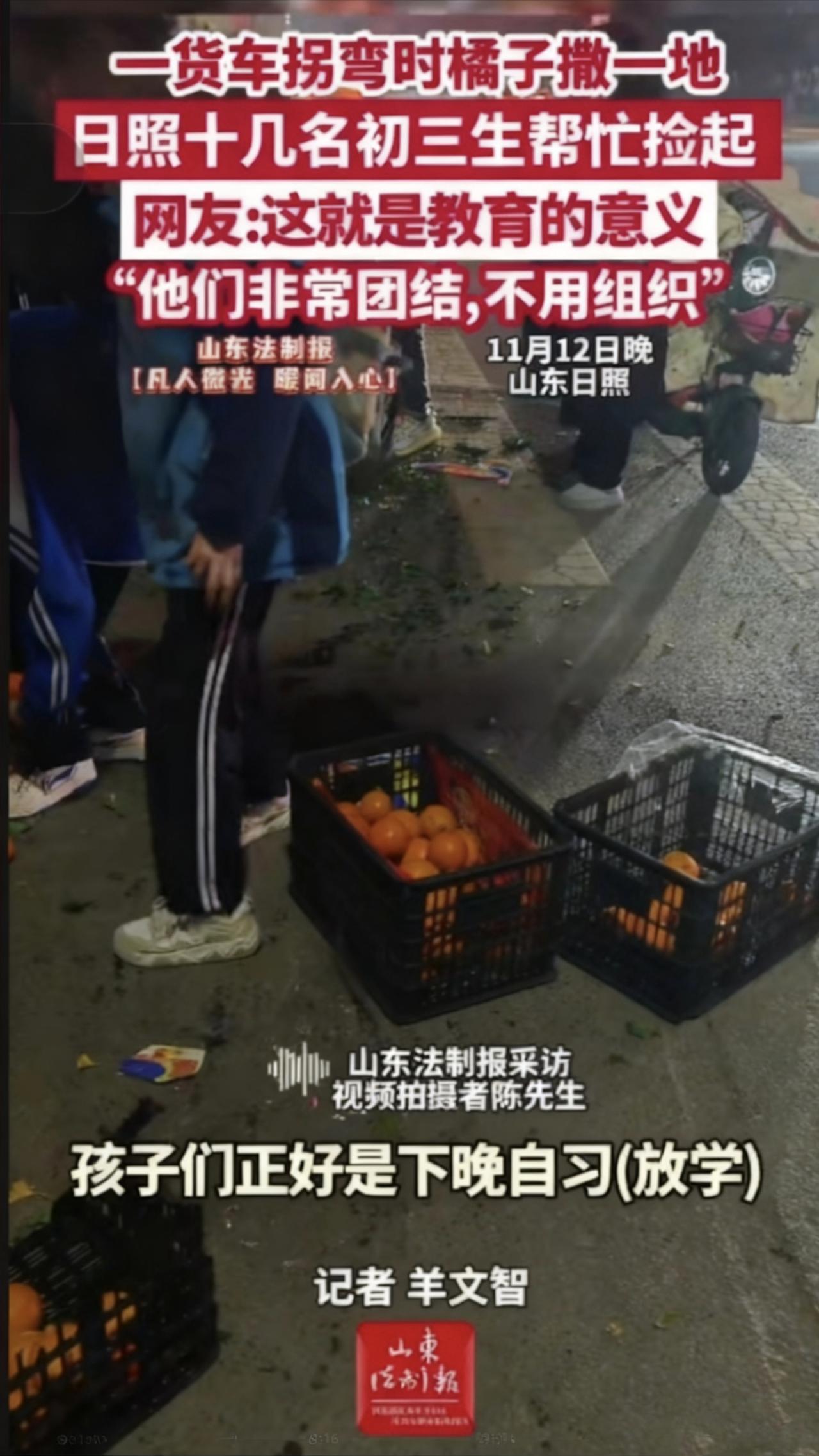 山东日照深夜暖心一幕:货车拐弯橘子散落,这群中学生的选择看哭全网。 11月12日晚,山东日照莒县的街头夜色渐浓,下晚自习的学生们正踏着暮色赶路,一场意外突然打破了宁静。一辆满载橘子的货车在拐弯时因车速稍急,几筐橘子瞬间滑落,金黄的果实滚得满地都是,车主看着散落的货物,急得手足无措。 就在车主慌乱之际,令人动容的一幕发生了:路过的莒县六中初三学生们,没有丝毫犹豫和观望,不约而同地停下脚步,自发围拢过来帮忙捡橘子。有的学生弯腰快速捡拾滚到路边的橘子,有的小心翼翼将橘子装进筐里,还有的主动帮车主稳住倾斜的货筐,原本散落的橘子在孩子们的默契配合下,很快被重新归拢整齐。 整个过程中,没有老师组织,没有家长叮嘱,更没有任何利益驱使,孩子们用最纯粹的善意,上演了一场温暖人心的“集体救援”。当车主看着拾掇整齐的橘子,满心感激地想让孩子们拿些橘子带回家尝尝时,孩子们却纷纷摆手拒绝,脸上带着腼腆的笑容,默默转身重新汇入放学的人流中,消失在夜色里。 这一幕被路人拍下传到网上后,迅速引爆全网热议,网友们纷纷留言点赞:“这才是少年该有的样子!”“善良是刻在骨子里的教养,这群孩子太棒了!”“看到他们,就看到了中国未来的样子,温暖又有力量”。还有网友感慨:“没有争抢,没有索取,只有发自内心的互助,这份纯粹的善意比黄金还珍贵”。 在这个偶尔让人感到冷漠的时代,这群初三学生的举动,就像一束光,照亮了人心最柔软的角落。他们用实际行动告诉我们,善良从来都不是刻意为之的表演,而是刻在骨子里的本能;互助也不是需要动员的任务,而是发自内心的共情,没有惊天动地的壮举,只是弯腰捡拾的平凡瞬间,这一刻教育的意义到达顶峰。却让我们看到了人性最本真的美好——那份不掺杂质的善意,那份无需提醒的自觉,那份少年人独有的纯粹。 其实,在我们身边,这样的温暖从未缺席。但正是这些看似微小的善举,一点点汇聚成社会的暖流,让我们在奔波忙碌中感受到人与人之间的温情。这群莒县六中的学生,用他们的行为诠释了“团结”与“善良”的真正含义,也给成年人上了生动的一课:善良不分年龄,教养无关贫富,最动人的美好,往往藏在最纯粹的心灵里。 愿这份少年意气能感染更多人,愿我们都能守住心中的善意,在他人需要时伸出援手,让互助成为一种习惯,让善良成为社会最动人的底色。而对于这群可爱的孩子,我们有理由相信,带着这份纯粹的善意前行,他们的未来一定会闪闪发光。 你是否也被这群少年的善意打动?如果是你遇到这样的情况,会做出怎样的选择?欢迎在评论区分享你的看法,为这群暖心少年点赞!捡拾散落到路边的橘子 集体救援