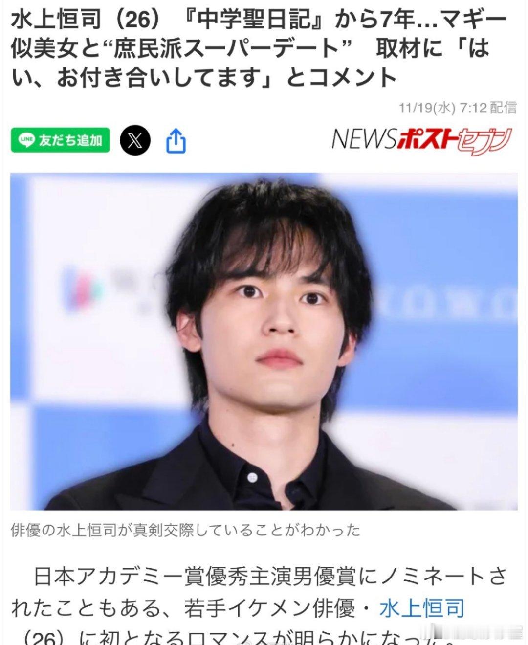 日本爆瓜也搞雷声大雨点小这一套啊??预定今日公开的“国宝级帅哥男演员”与“年长身材高挑美女”的初罗曼史❤️是水上恒司(26岁)与长得像模特マギー的年上女友牵手约会,面对采访,水上大方承认事实——“是的,我们正在交往,没有什么好隐瞒的”。这又是哪位??