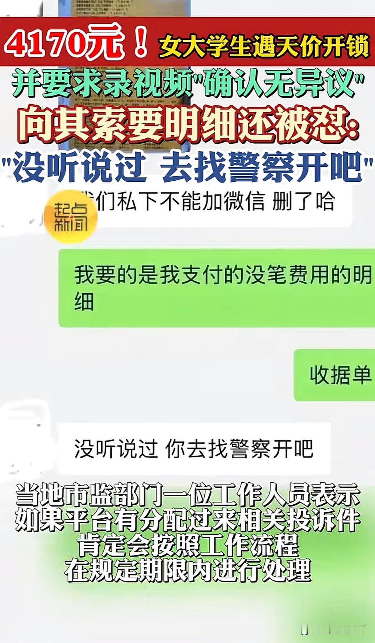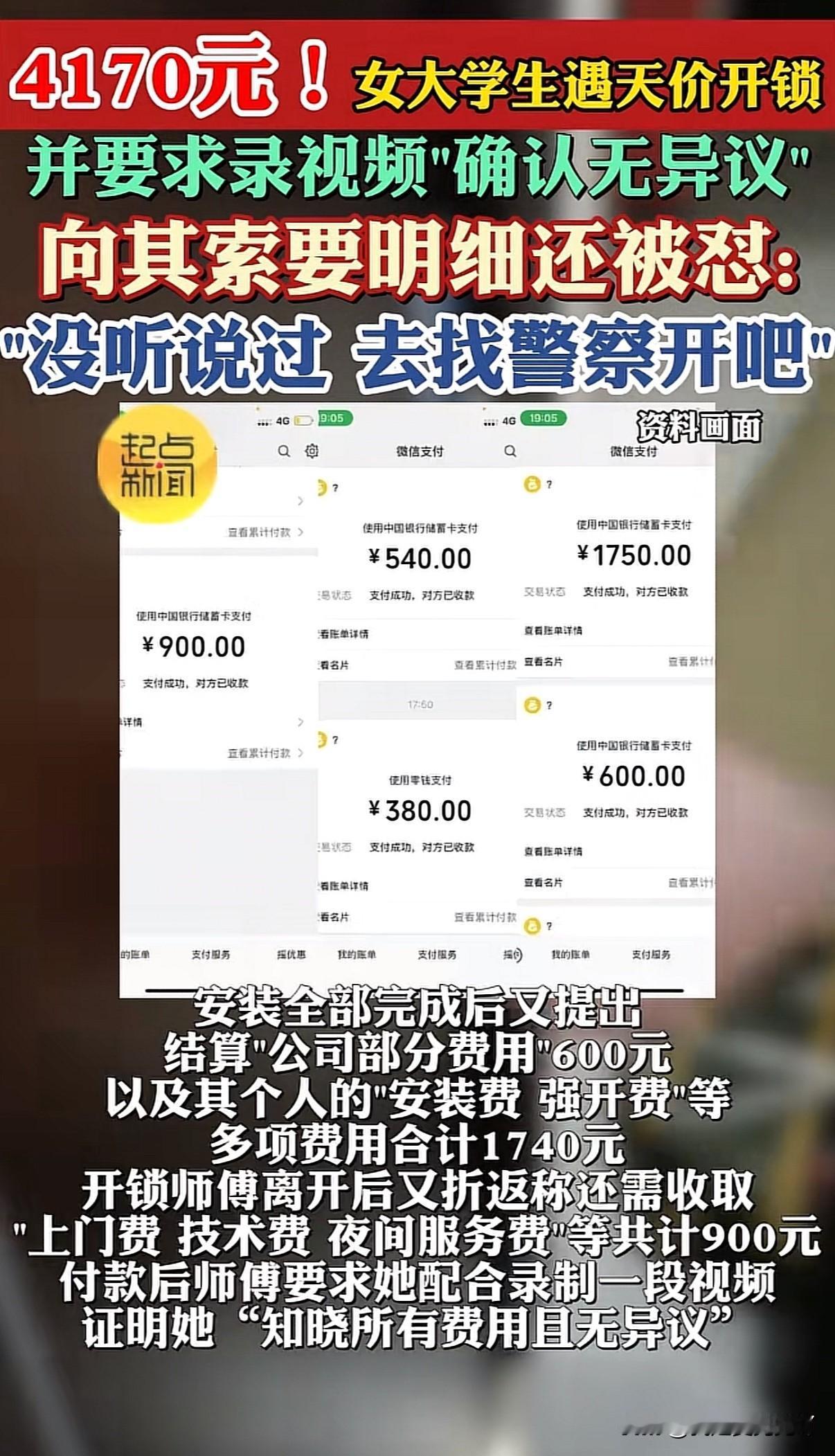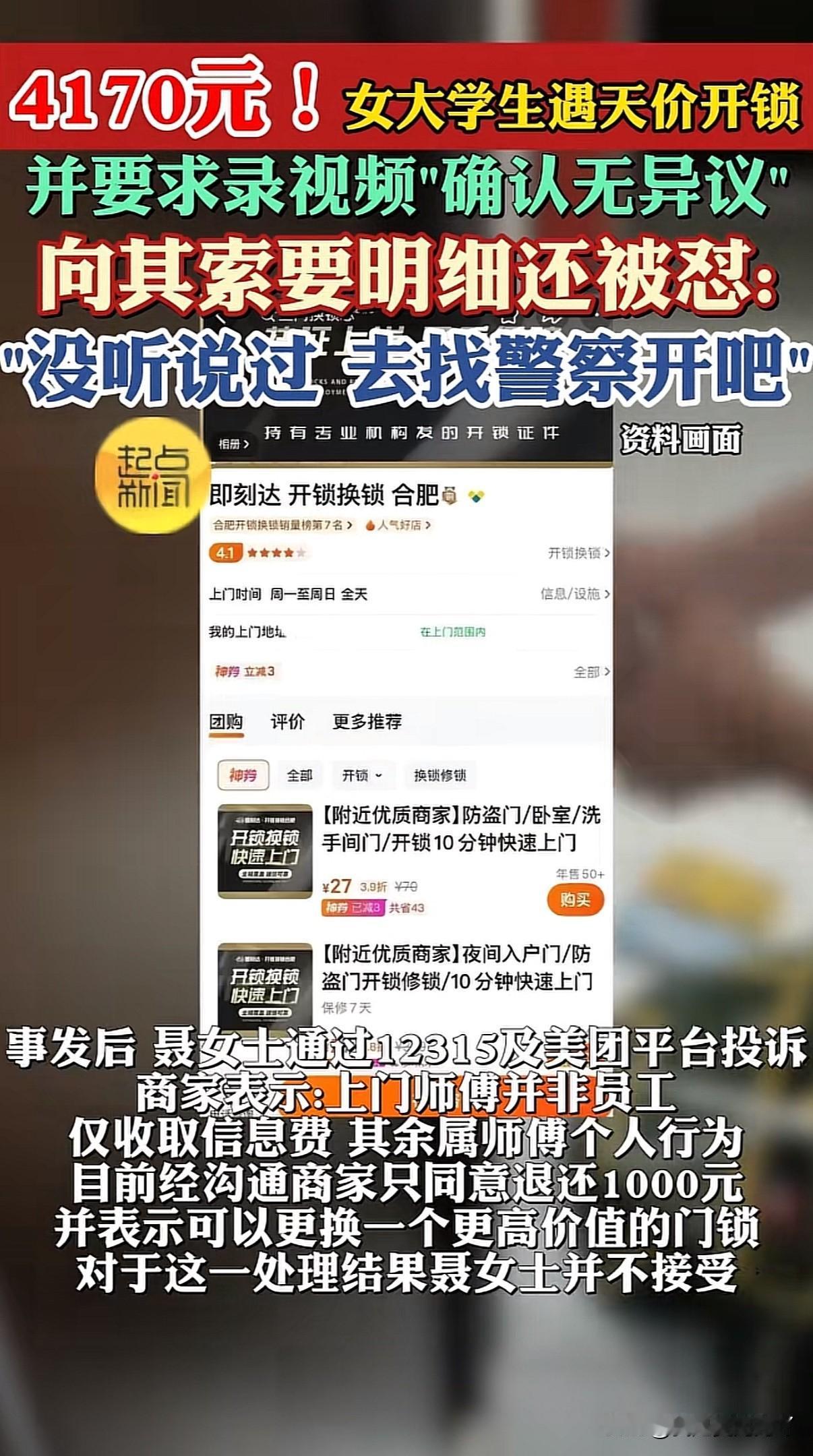 独居女大学生找人开锁,被多次追加费用直到4170元并被强制录视频表明认同其收费,索要收据被怼:没有,去找警察要 近日安徽合肥一女生发布求助贴称因不小心将钥匙落在家里,在美团花27元团购找到即刻达开锁,不料开锁过程被层层加价,开锁一共支付了4170元 女子表示下单后客服要求提供手机号码,她提供后接到电话要到地址后表示马上会派人上门,开锁的人到了之后看了一眼提出是c级锁只能强开,会损坏锁芯跟面板要付540元,女子以为540是全部费用同意后又被告知主体也坏了要换再付380元。换好后再次向女子要钱表示还要给平台600块,这不包括他的上门费和强开费、安装费1740元。还有夜间服务费900元。并拿出手机录像让女生对着镜头说明确并认同收费。女子因担心个人安全加之是夜晚不想与之纠缠全额支付共计4170元后开锁人离开 事后女子发短信要求其提供收据回复称:没听说过,你去找警察给你开吧 女生向美团以及12315投诉后商家表示开锁师傅是外包人员属于个人行为,公司愿意退还其1000元女生表示不能接受 目前女子表示双方已经和解、具体和解方案不愿透露 商家注册地三里街市监局,工作人员表示已接到相关投诉正在按流程处理 信源:起点新闻