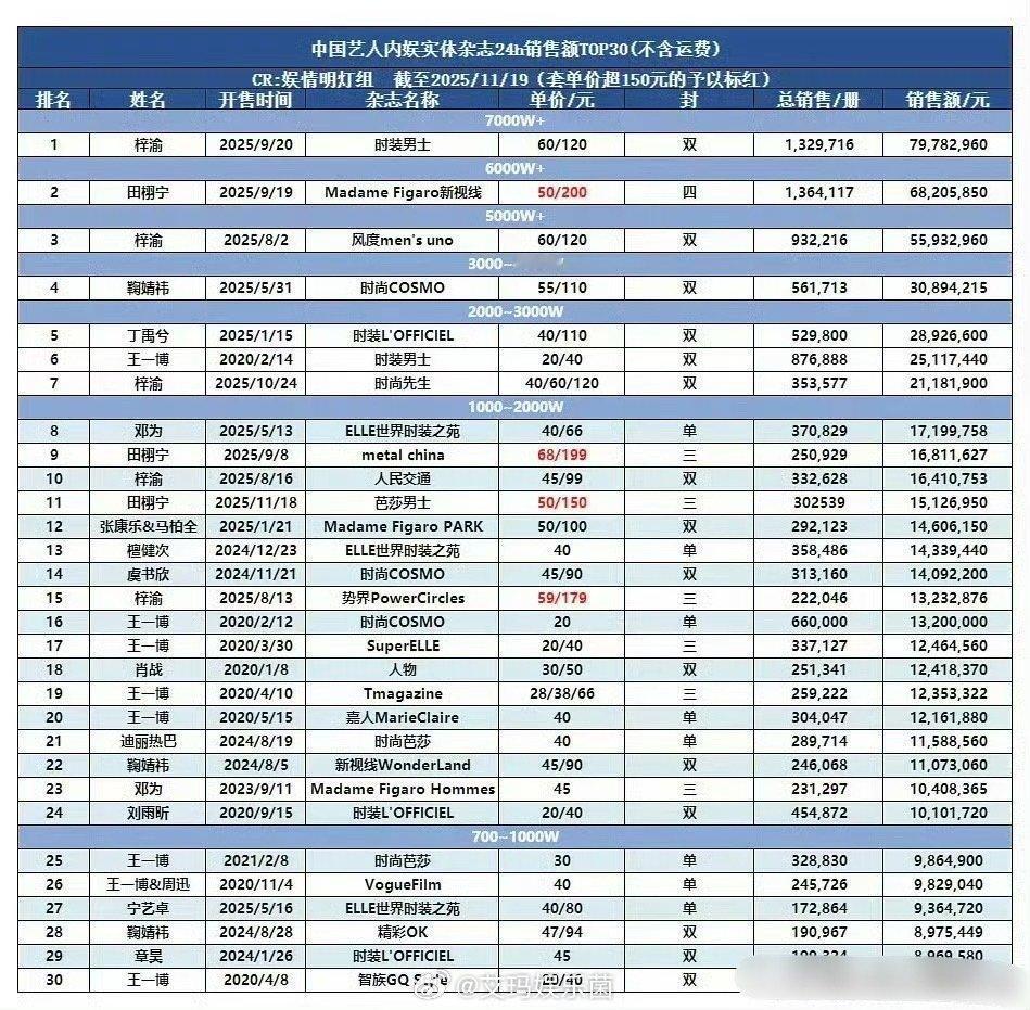 顶峰相见的二位梓渝《时尚先生》双封面35分钟1700w田栩宁《芭莎男士》三封面1小时1144w