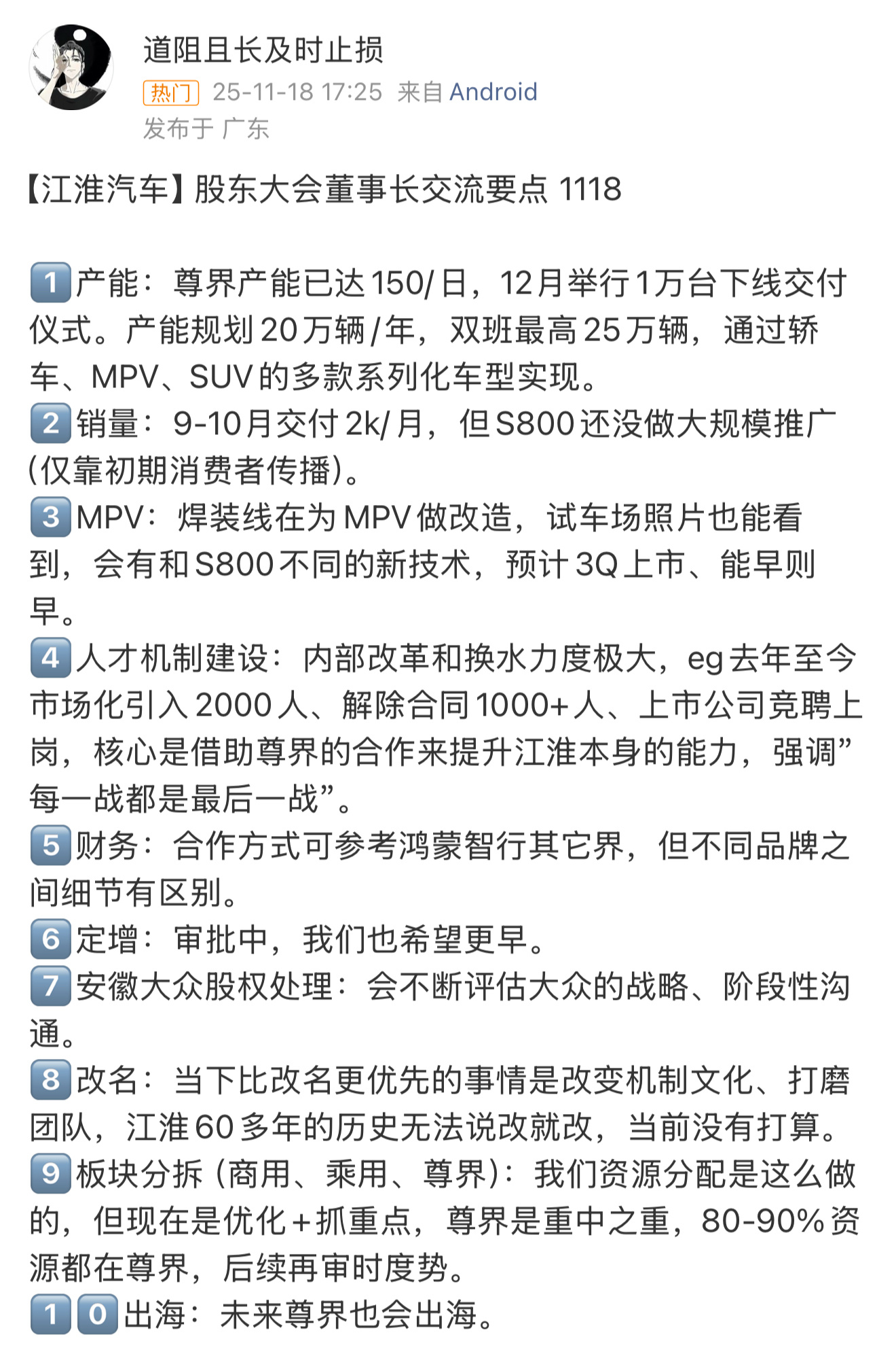 目前,尊界日产能已达150辆,12月举行第一万台下线交付仪式。全新MPV将搭载与S800不同的新技术,并计划Q3上市。未来尊界会出海发展。