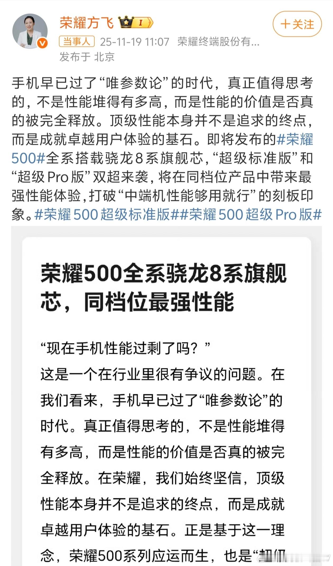 中端机是受用最广的,在性能上最不能妥协,它立足的核心,就在于以合理的价格提供“足够好用”的体验,无论是游戏流畅运行、相机清晰记录,还是系统响应迅速,都应稳定可靠。但是现实中,不少中端机虽纸面参数不弱,实际使用中却容易出现帧率波动、拍照延迟、多任务卡顿等问题。就像荣耀官方说的一样,性能堆的多高不是重点,重点是性能释放了多少。很期待这次荣耀500系列带来的惊喜。