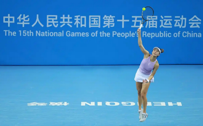 网球女单半决赛,安徽队 6-3/6-2横扫东道主选手王欣瑜,从09年首次参赛,职业生涯五战全运会终首进女单决赛。