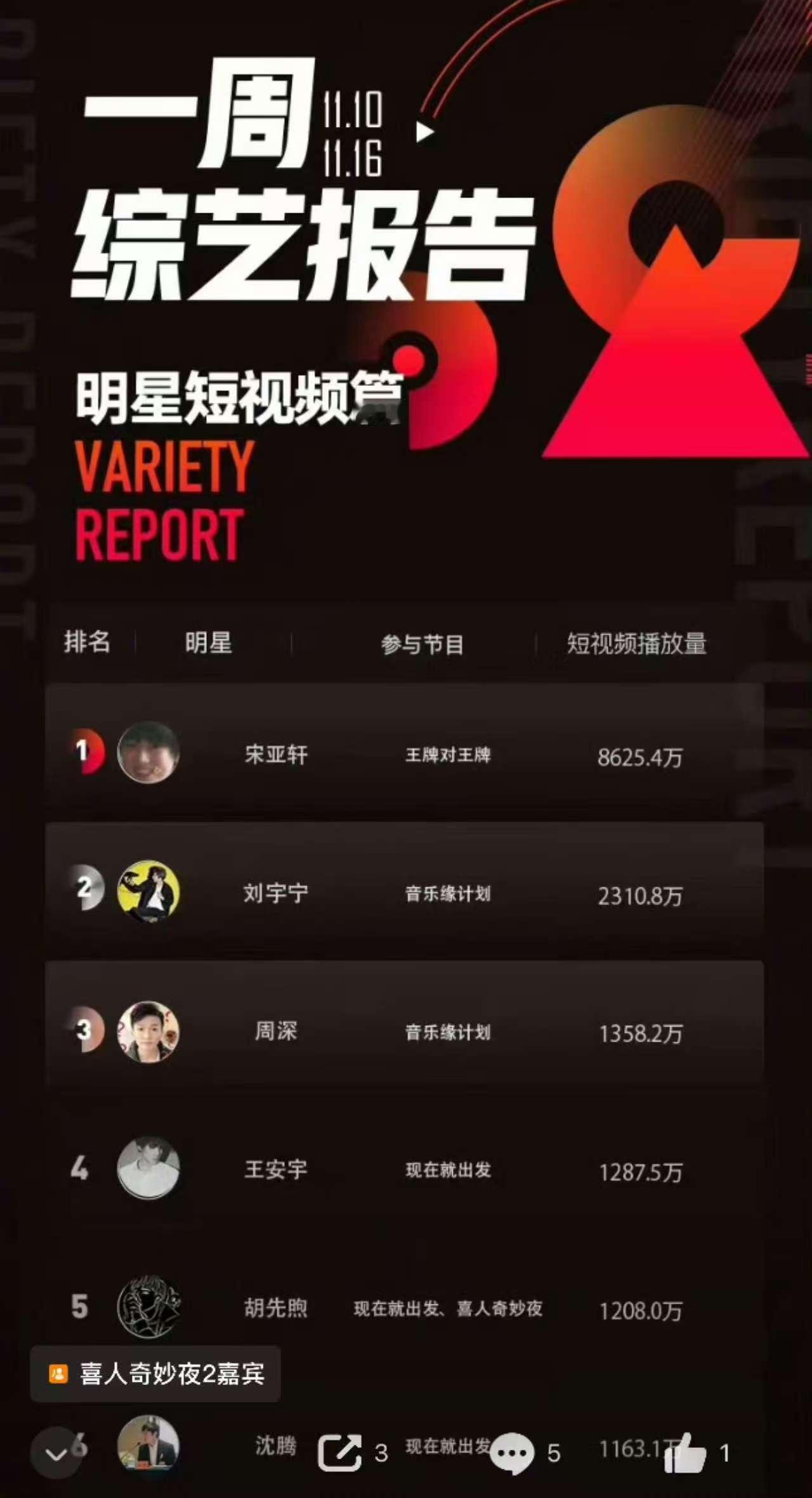 宋亚轩一周综艺报告明星短视频篇top1,厉害,👍🏻👍🏻