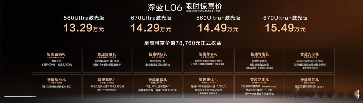 13.29万开出百万超跑驾控感?深蓝L06让你触手可及2025年11月18日,“长续航磁流变激光智能轿跑”深蓝L06价格及权益发布。新车共推出四款配置车型,售价13.29万元起,同时推出至高价值78760元的购车权益,并承诺将为11月30日前锁单,且非客户原因导致跨年交付的用户兜底全部购置税,以极具诚意的姿态登陆15万级纯电市场。在以“年轻就去绽放”为主题的发布会现场,深蓝L06品牌大使刘浩存亲临助阵。作为深蓝L06首位车主,刘浩存与深蓝汽车董事长邓承浩一起为首批车主现场交付新车,共同开启属于年轻人的驾控新篇章!深蓝L06专为填补年轻人“纯粹驾趣”细分场景而来,致力于将顶尖科技引入主流市场。新车汇聚“4项全球首发、2项行业首发”硬核科技,以及“6项同级唯一、6项同级领先”的行业领先实力,成功打响“公路磁悬浮”鲜明产品标签的同时,更以“驾控之王、辅助驾驶黑马、座舱新贵、全系宁德、续航领先”五大维度越级配置,为年轻用户带来手心冒汗、心跳加速的极致驾控感受,堪称一台真正和年轻人同频共振、玩在一起的Dream Car!驾控之王:百万超跑同款磁流变悬架,真正实现人车合一作为中国品牌首款量产搭载磁流变悬架的车型,深蓝L06真正将“贴地飞行的稳”与“人车合一的准”带给年轻用户群体。其悬架响应速度每秒可达1000次,比传统CDC快10-20倍,软硬调节范围更宽至6倍,真正实现“飞坡不跳、过弯不偏”的超跑级操控质感。为实现极致驾控,深蓝L06更采用同级唯一的一体化压铸车身、CTV电池车身一体化集成技术,与特斯拉Cybertruck同款工艺的一体式热成型双门环,以及先进的后驱专用平台,共同构筑起“公路磁悬浮”的硬核基底。这不仅让它在中汽中心麋鹿测试中以85.6km/h的成绩超越保时捷911,更在日常通勤中带来“拥堵不晕、高速不飘”的全场景安心。从连续飞坡到急速变道,从山路攻弯到拥堵跟车,深蓝L06以“又快又稳”的操控实力,让每一次驾驶都成为享受。辅助驾驶黑马:真·一段式端到端,让新手驾驶员秒变“老司机”在智能化成为核心竞争力的今天,深蓝L06并未停留在硬件堆砌,而是以“更懂中国路”的智能辅助驾驶体验,树立行业新标准。新车全系标配激光雷达和两颗地平线J6M芯片,并首发搭载深蓝智能驾驶辅助系统DEEPAL AD Max,采用与特斯拉同类的一段式端到端智能驾驶辅助算法,实现从感知到控制的“一气呵成”;30000+中国道路场景数据集,为用户构建起覆盖高速、城区、泊车全场景的“新手友好型智能辅助驾驶体系”,轻松实现“有路就能开,有位都好停”的出行体验。结合全系标配的30多项主动安全功能,无论是复杂城区的无保护路口通行,还是狭窄车位的一键泊入,深蓝L06都能精准判断、流畅控车,让新手驾驶员也能像“老司机”一般从容应对,真正告别上路慌、停车难的困扰。同时,深蓝L06更带来行业首次量产城市自主漫游功能。当用户想在闲暇之余放松心情却无明确目的地时,只需开启此功能,车辆即可自主规划路线,带来一场随心而动的City Drive,让出行充满探索的乐趣。座舱新贵:3nm车机芯片丝滑流畅,智能体验媲美手机深蓝L06全球首发搭载天玑座舱S1 Ultra 3纳米车规级芯片,安兔兔车机跑分达1637481分,领先第二名33%,极致丝滑媲美苹果手机,让用户彻底告别卡顿与等待。基于强大算力,深蓝L06行业首发四图融合实景车道级导航。并依托15.6英寸2.5K超高清向日葵屏与50英寸AR-HUD全息式增强现实系统,将基础导航、车道级导航、SR渲染与环境重构融为一体,一屏显示全部导航与驾驶辅助信息,真正实现 “不分屏、不分心” 的沉浸式导航体验。而趣味互动、隧道主题、地标复刻等功能,让用户的每一次出行,在高效可靠之余,增添了一份轻松与乐趣。此外,车辆更搭载7.1.4天空声场,高品质18扬声器搭配双杜比认证实验室专业调校,再加上便捷的无麦K歌功能,让车内秒变移动KTV,随时畅快开唱。正如品牌大使刘浩存所说:“深蓝L06就像一个又好看又可靠还很有趣的朋友,如果你也在找一台让你安心又开心的车,我真的觉得可以试试深蓝L06。”安全基石:全系宁德时代电芯+670km超长续航,成就出行高安全、续航零焦虑深蓝L06全系搭载宁德时代磷酸铁锂电芯与金钟罩电池系统,基于新国标安全要求开发,实现“60万公里衰减无感知、66万辆电池零过热”的卓越表现,真正做到“不起火、不爆炸、不冒烟”,从根源上守护用户出行安全。在筑牢电池安全基座的同时,深蓝L06更以一套完整的“续航无忧方案”,全面化解用户对里程与补能的焦虑。新车搭载新一代原力超集电驱,全球首发I-TECH主动功率控制技术,电量只剩5%,零百加速也能跑进5.9s;深蓝原创I-TECH末端脉冲充电技术,80%充至100%仅需18分钟,3C超充技术支持15分钟快速补能335公里,喝杯咖啡即可“续航回血”;配合同级领先的670km超长纯电续航及能量管理专家,百公里电耗低至11.5kWh,轻松应对跨城旅行与日常通勤,实现“两周只充一次电”的用车节奏。此外,深蓝L06全系标配热泵空调,零下7℃续航可提升40km,冬季续航更稳定;更搭载深蓝原创宽温域微核高频脉冲加热技术,即使在-30℃极寒环境下,充电时间仍可缩短54.6%,让北方用户在冬季用车时同样从容。从“跑得远”到“充得快”,再到“全天候可用”,深蓝L06真正让纯电出行变得自由、可靠。随着深蓝L06正式上市并启动全国交付,这款集五大优势于一