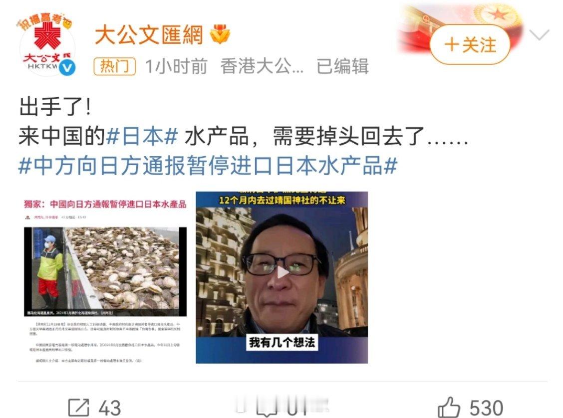 出手了!咱们国家的反制来了!中方已通知日本政府,暂停进口日本水产品!我希望此次暂