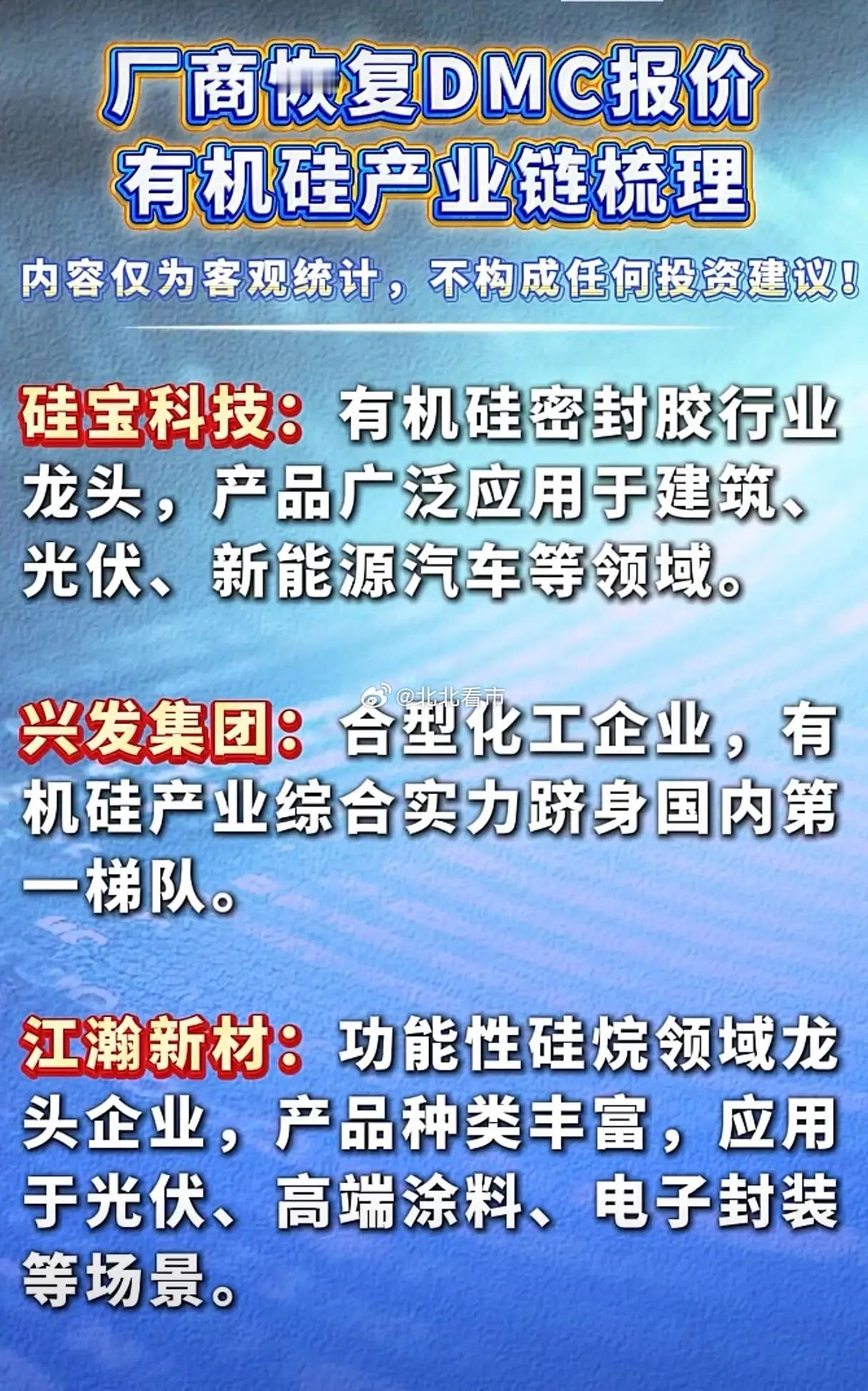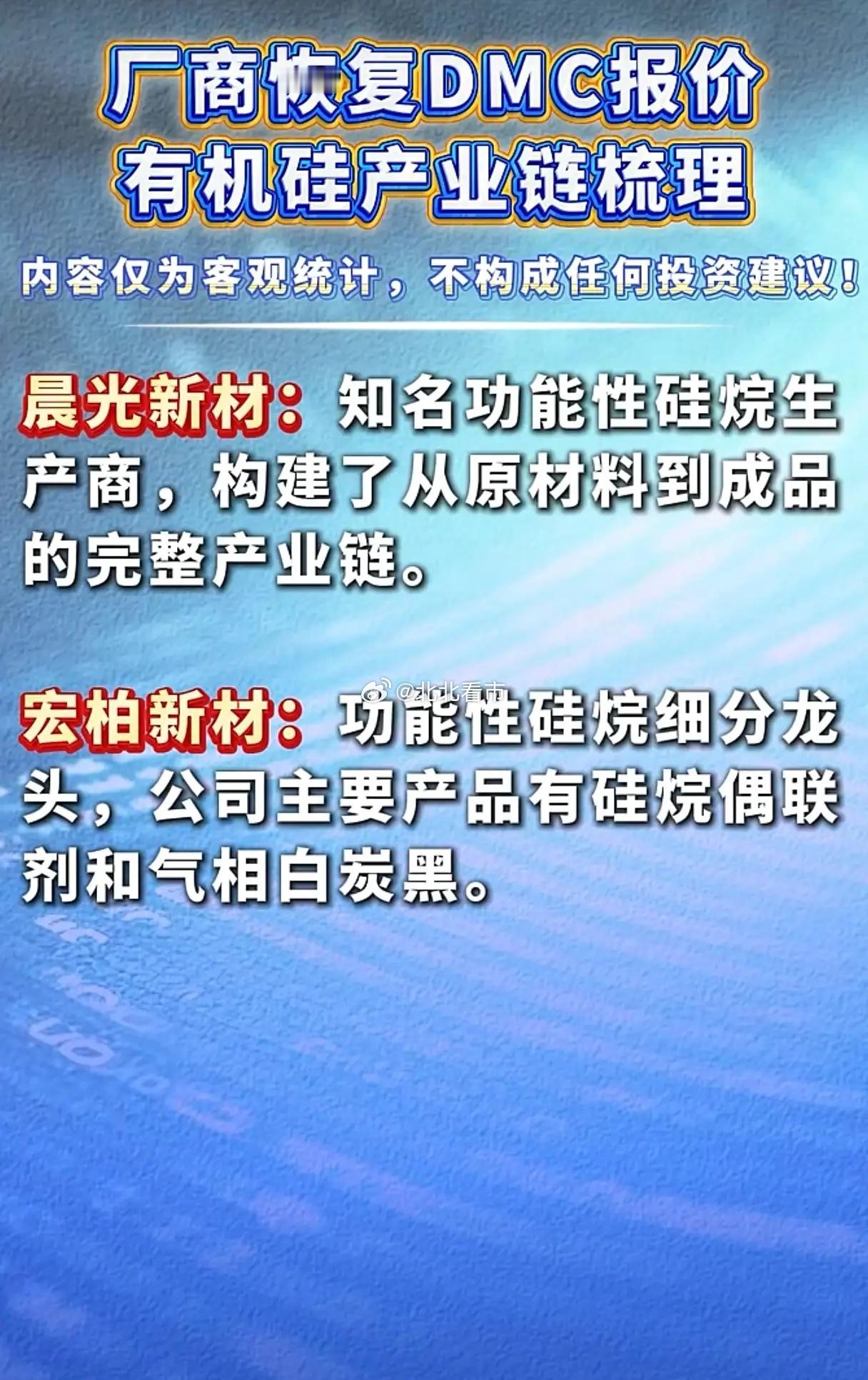 DMC报价重启,谁能扛起有机硅产业链的“顶梁柱”?当厂商恢复DMC报价的信号传来,有机硅产业链的“势力版图”又有了新的观察窗口——谁能在这条从原料到终端的赛道里站稳脚跟?全球硅基龙头合盛硅业,靠“工业硅-有机硅”闭环把成本优势焊死在产业链上游;新安股份一边握着国内有机硅的核心份额,一边用硅矿到终端的全链条布局,把草甘膦业务的协同效应拉满。而细分赛道里藏着更多“隐形王者”:东岳硅材把有机硅深加工扎进医疗、半导体的高端领域;硅宝科技的密封胶直接绑定光伏、新能源车的刚需市场;江瀚新材、晨光新材们,则在功能性硅烷的细分池子里,靠产品矩阵啃下光伏、电子封装的蛋糕。这条产业链的逻辑从来不是“谁大谁赢”,而是“谁能把环节吃深、把场景钉死”——从上游资源到下游刚需,从通用产品到高端细分,每个玩家的“护城河”,都是把自己嵌进产业刚需里的能力。